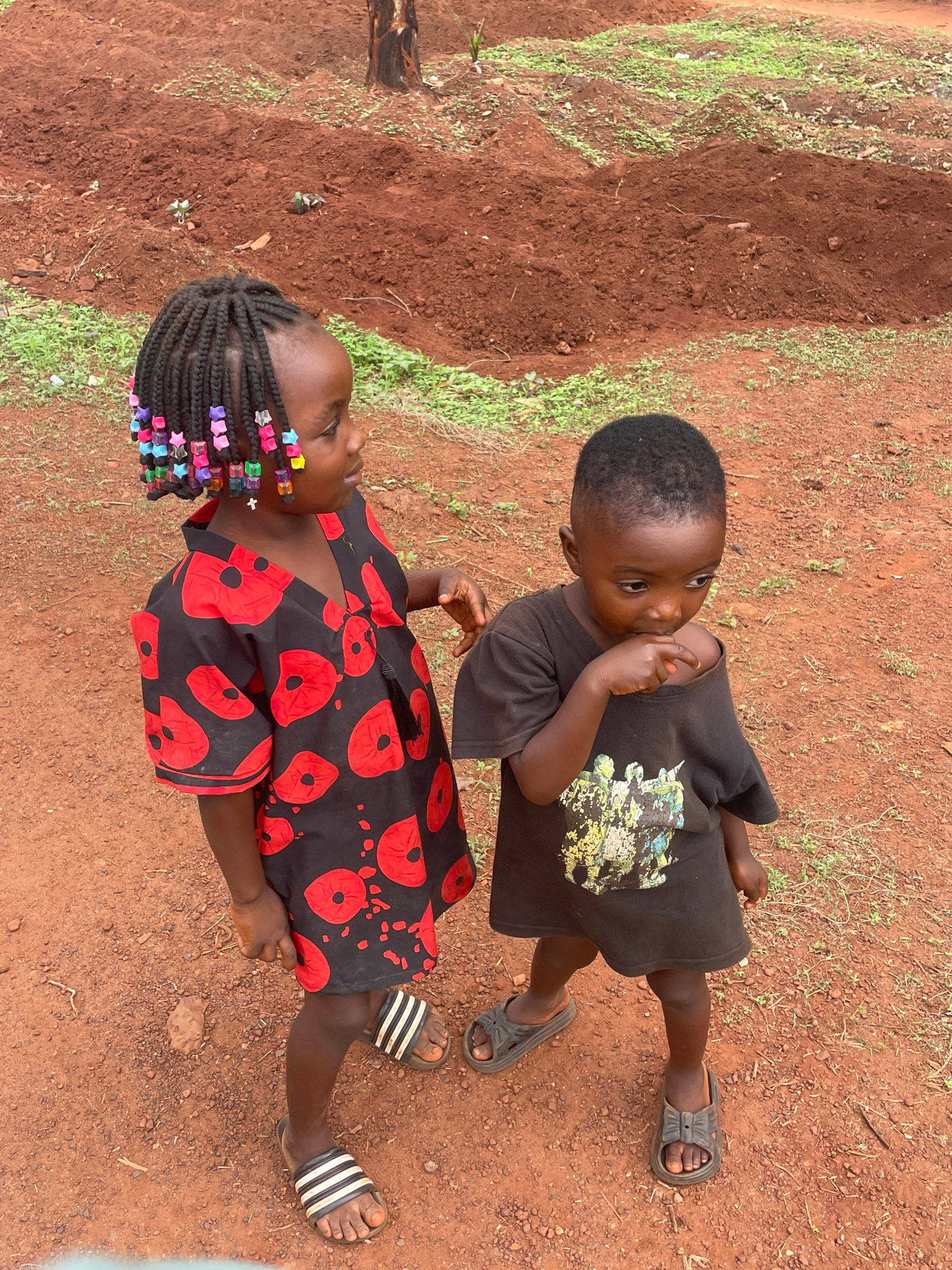 Two children stand on red earth ground in Ogbe, Nigeria. One child, facing the viewer, wears a black dress with large red poppy-like flowers, braids adorned with multicolored beads, and black and whit…read more