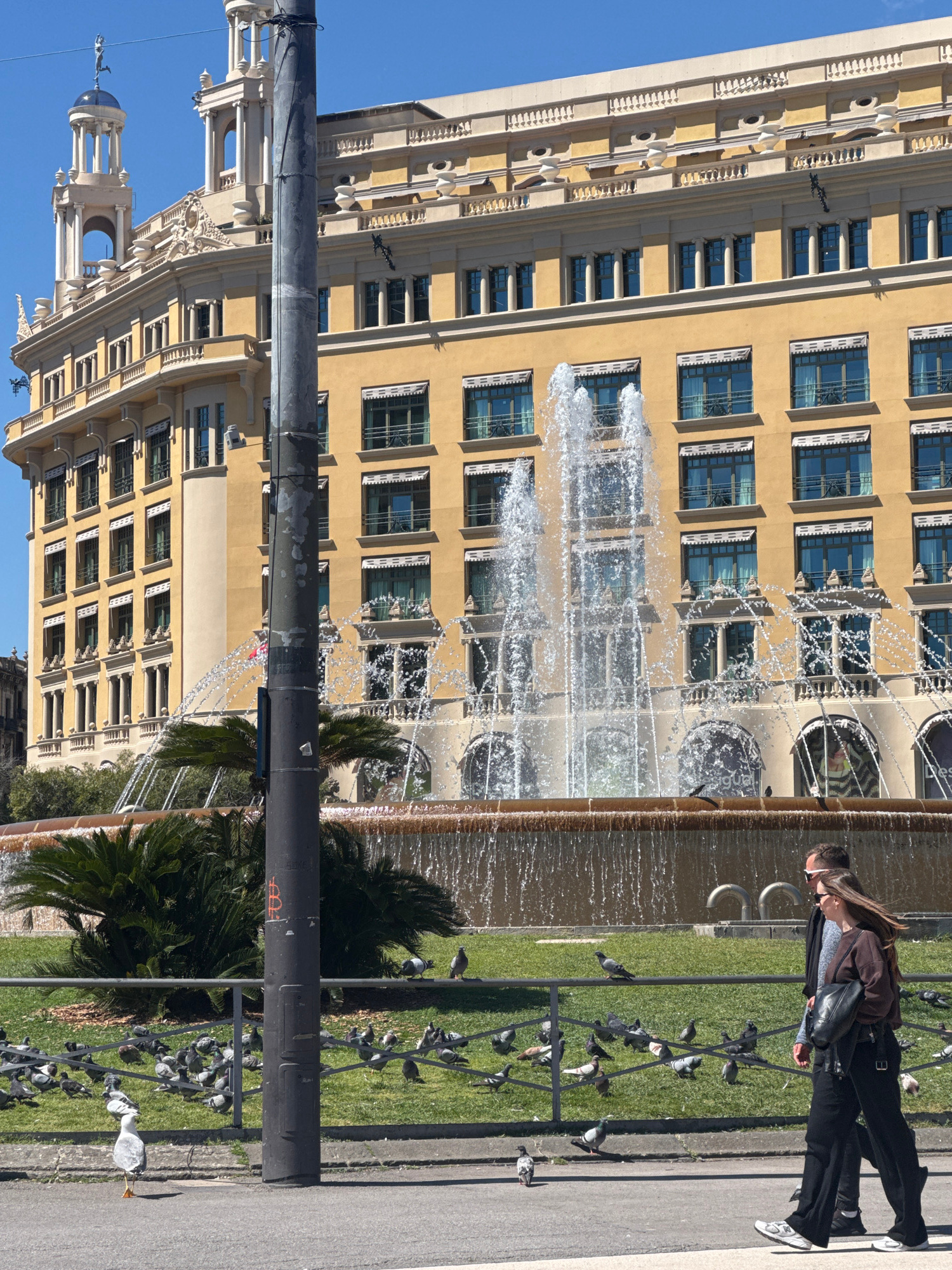 The image shows a street scene in Barcelona, Spain. A large, ornate building with multiple floors and windows stands in the background. In the foreground, a fountain with water spraying upwards is vis…read more
