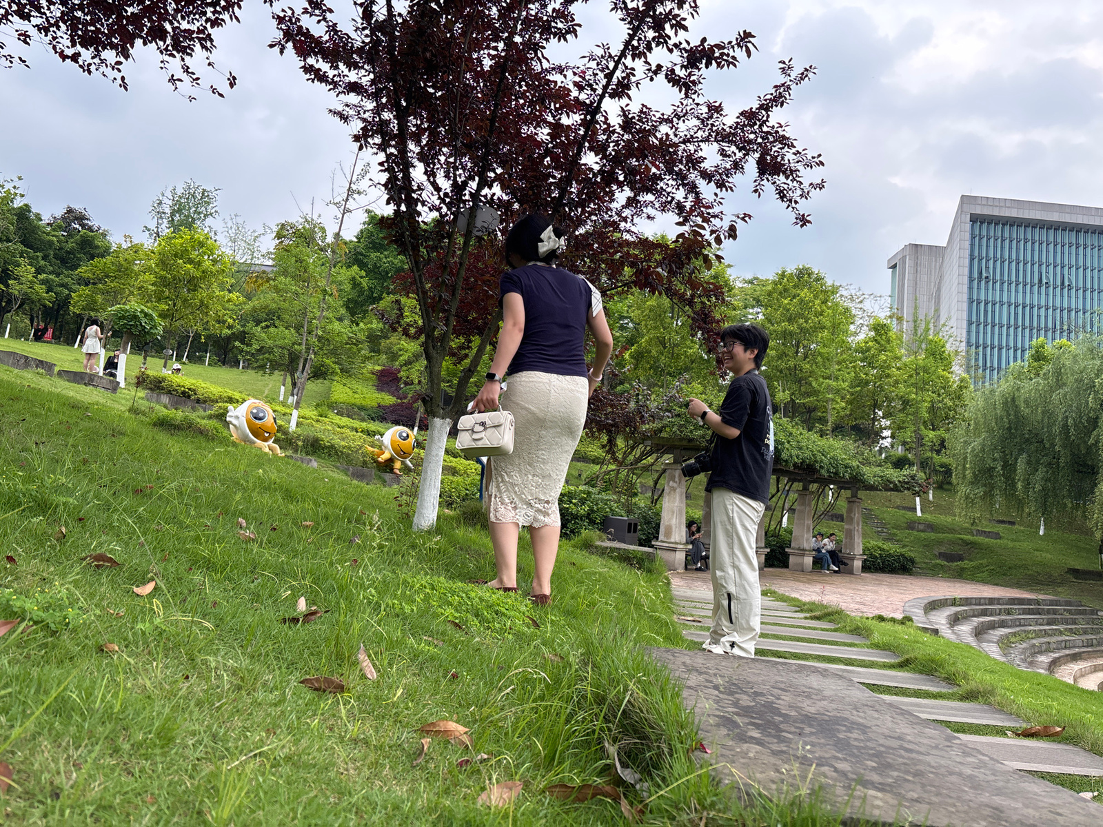 A daytime shot shows two people on a grassy hill. The person on the left is a woman wearing a dark blue short-sleeved shirt, a white lace skirt, and sandals. She carries a white purse and has a white…read more