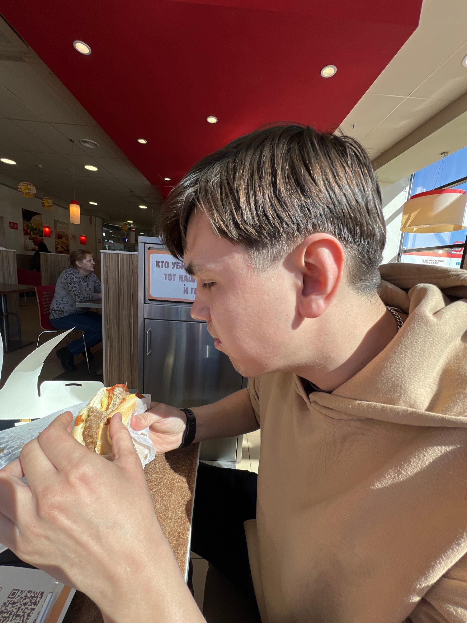 A young person, likely male, with medium-brown hair and wearing a beige hoodie, is captured in a close-up, downward-facing perspective. They are holding a burger wrapped in white paper with both hands…read more