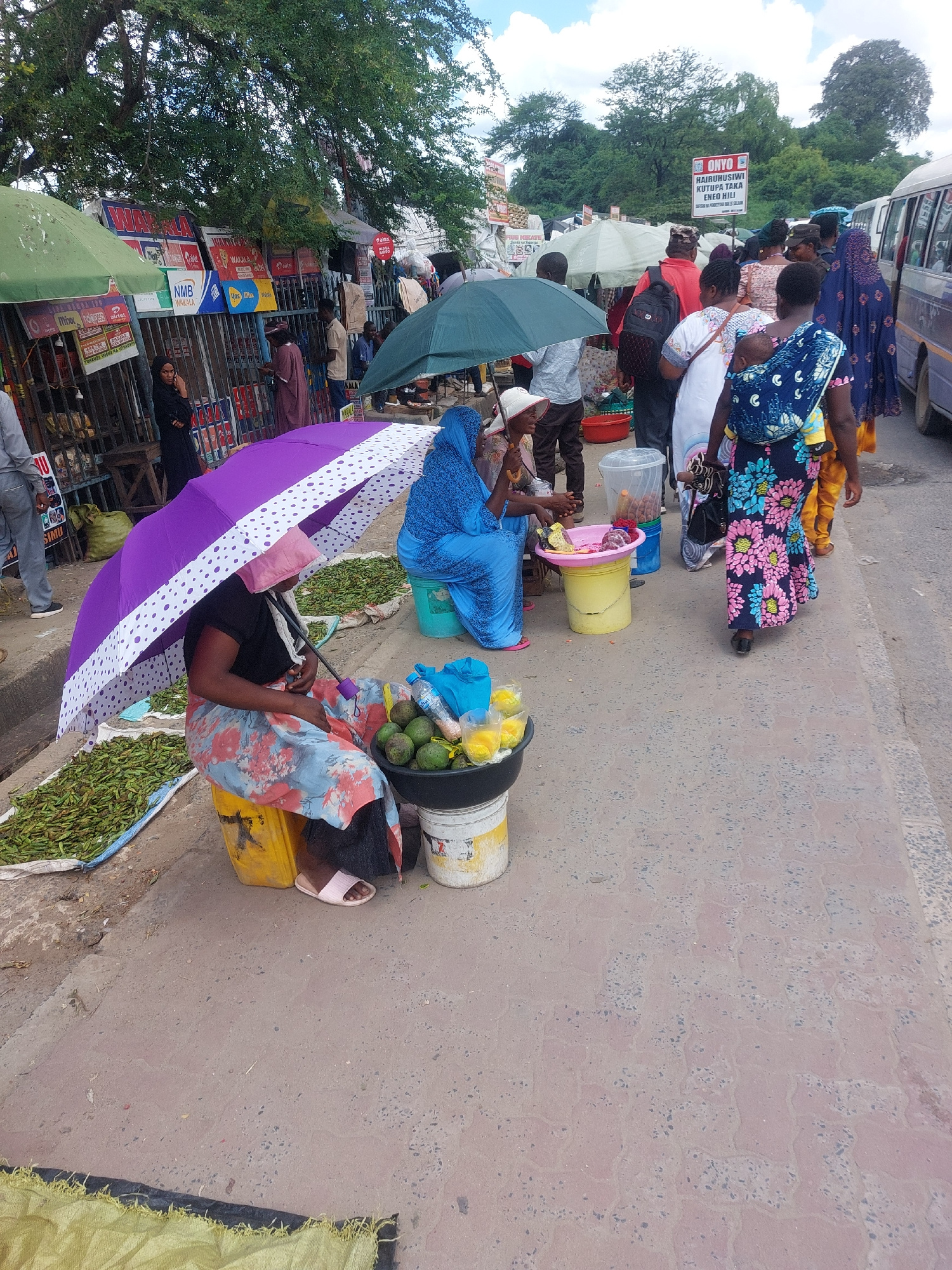 A busy street scene in Dar es-Salaam, Tanzania. Vendors sit on the ground next to the street with their goods for sale, including avocados, yellow fruit, and piles of green produce spread out on tarps…read more