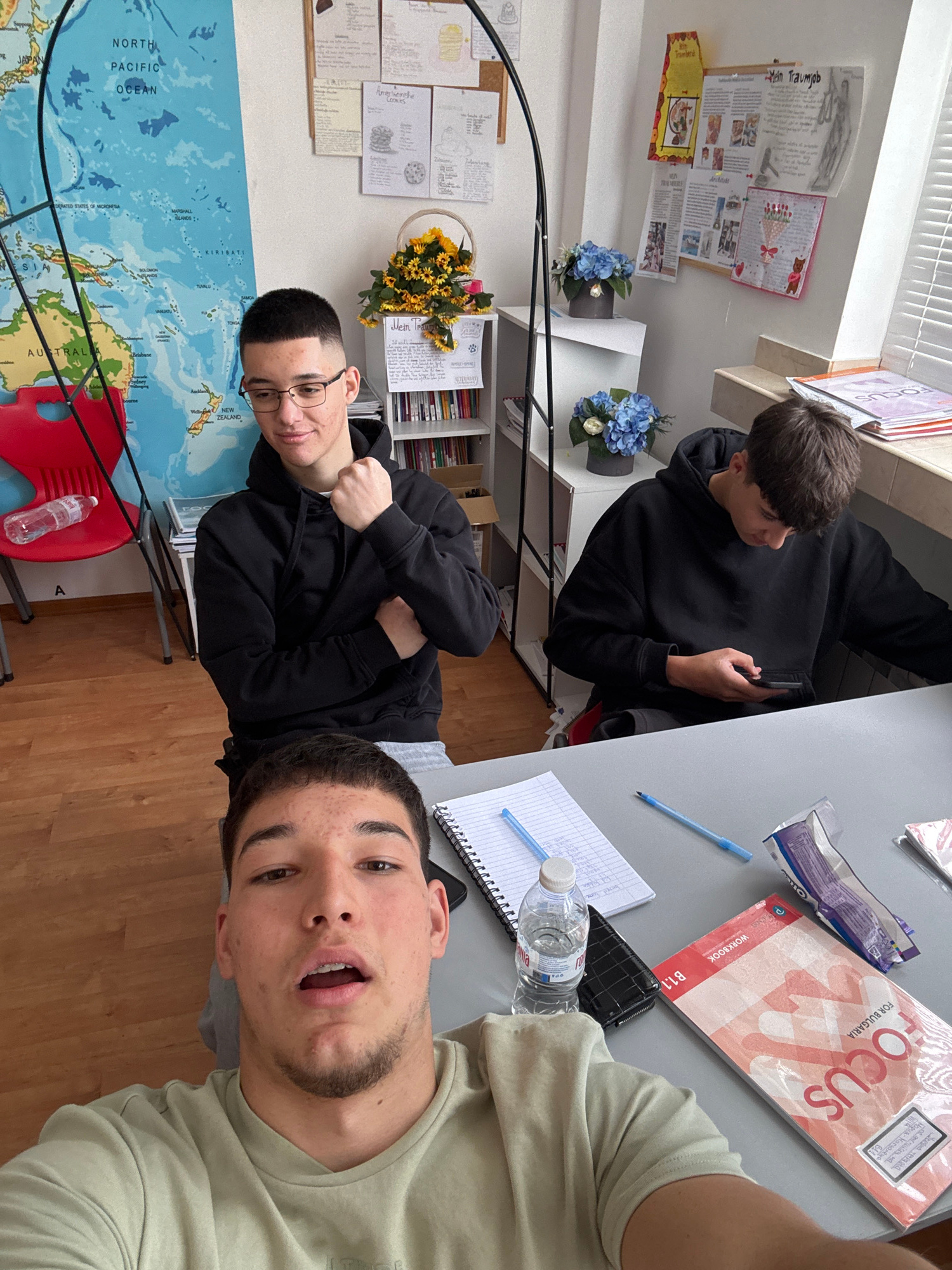 The image captures three young men in what appears to be a study room or classroom in Zlatograd, Bulgaria. The shot is a selfie taken by the young man in the foreground, who is wearing a light-colored…read more