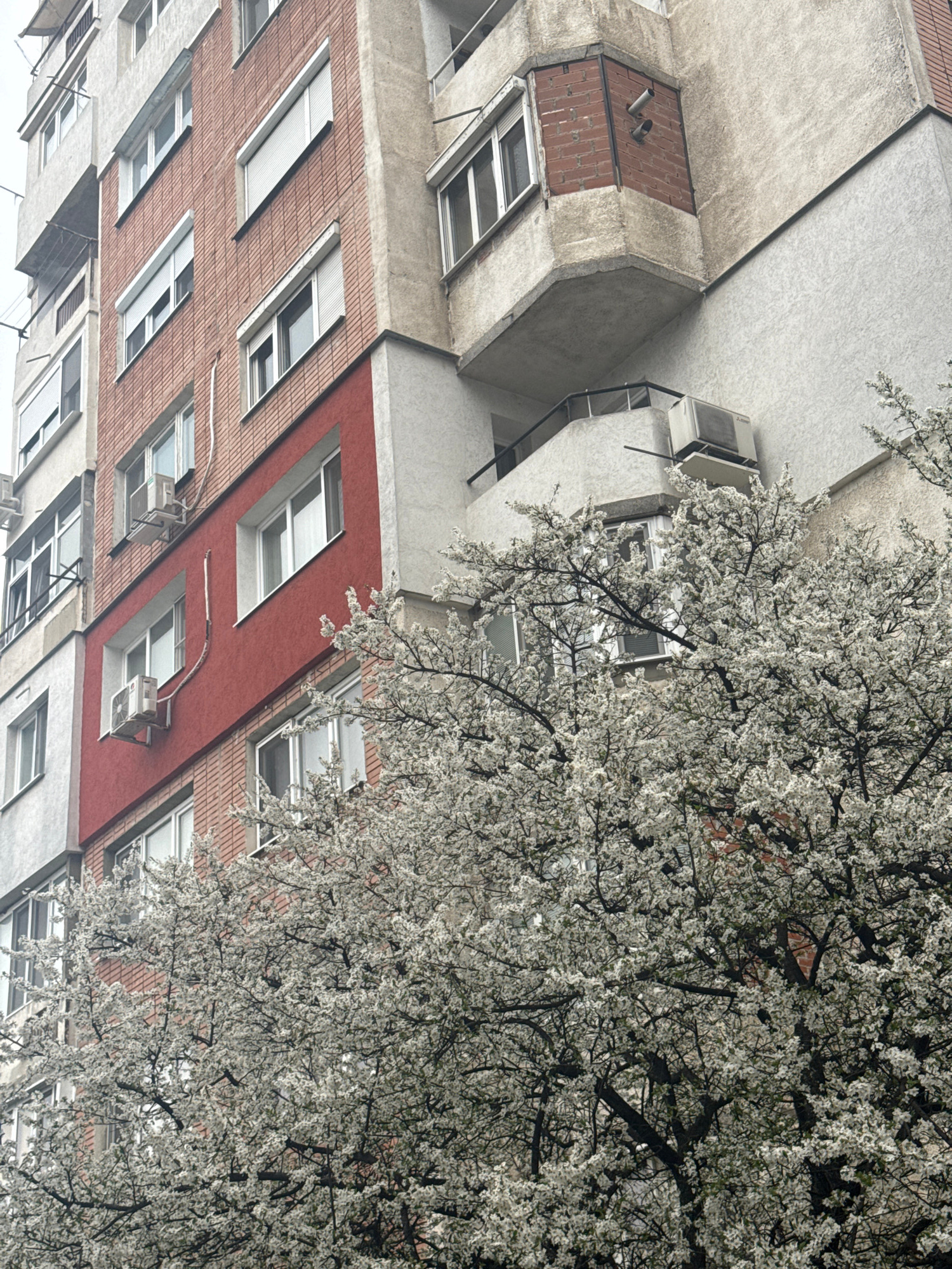 The image depicts the exterior of an urban building in Sofia, Bulgaria, captured from a low angle, likely street level. The building features a mix of architectural styles and materials, including bri…read more
