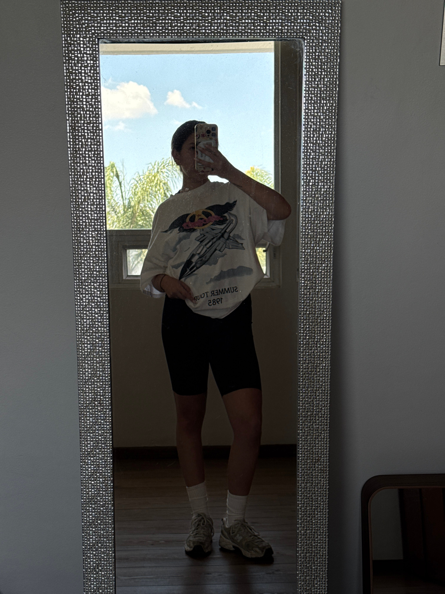 A person is reflected in a mirror, holding a cell phone up to their face. They are wearing a white t-shirt with a graphic print, black shorts, and white socks with sneakers. The mirror reflects a view…read more