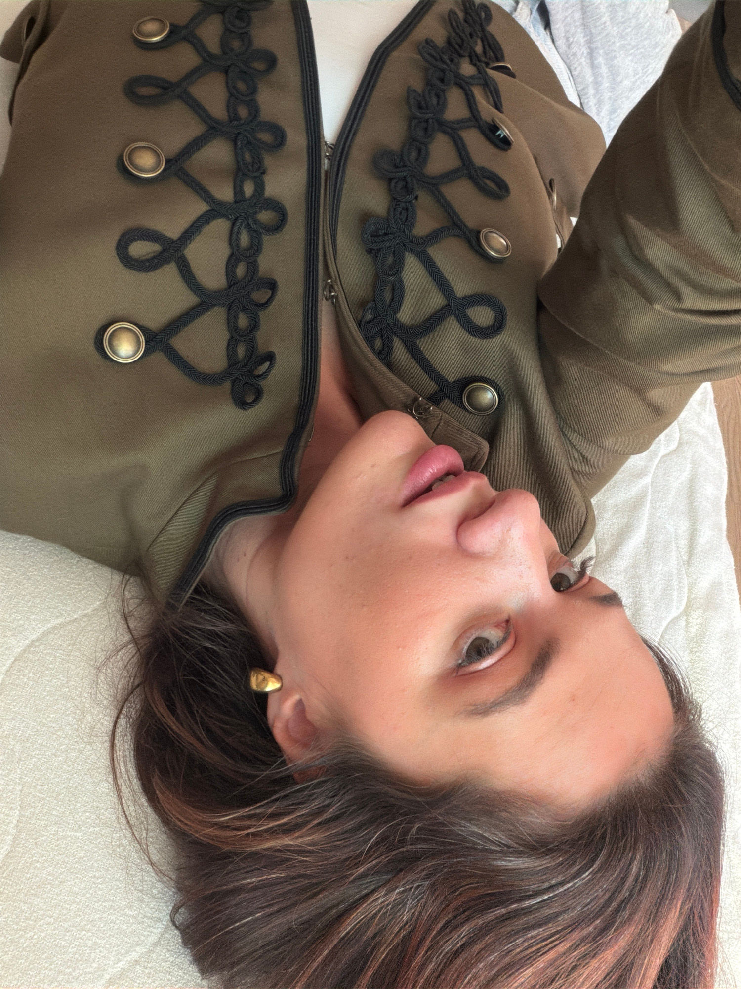 A woman is lying on a white textured surface, possibly a bed, wearing a military-style olive-green jacket adorned with black braided trim and metallic buttons. Her head rests on the surface, and her h…read more