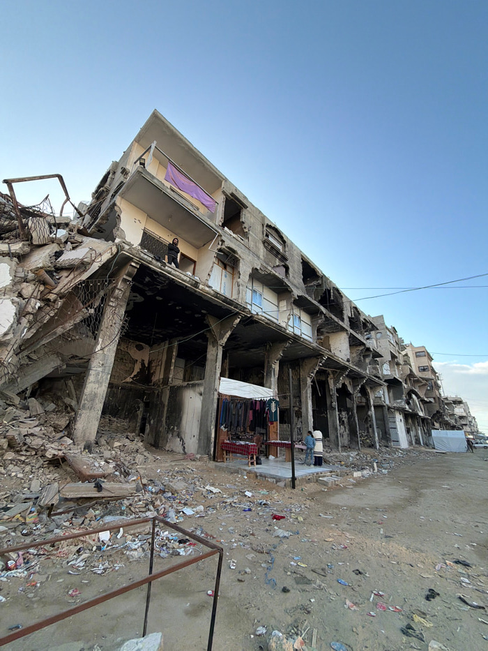 A multi-story building is severely damaged, with crumbled concrete and exposed rebar visible. Several floors are missing walls, revealing the interiors. Debris litters the ground surrounding the struc…read more