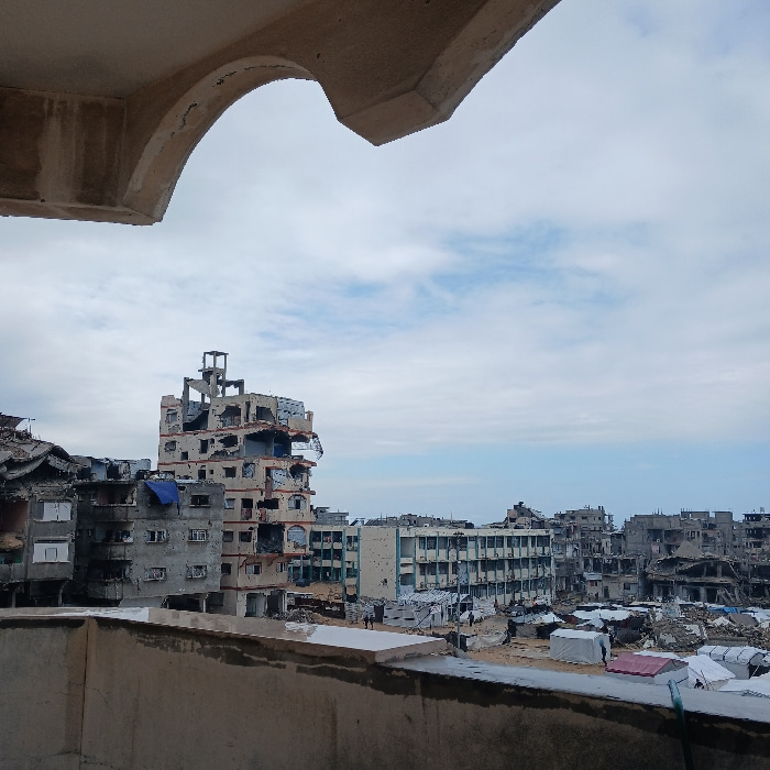 This image presents a high-angle view of a severely damaged urban area in the city of Gaza, Palestinian Territory, under a partly cloudy sky. In the upper foreground, an architectural concrete archway…read more