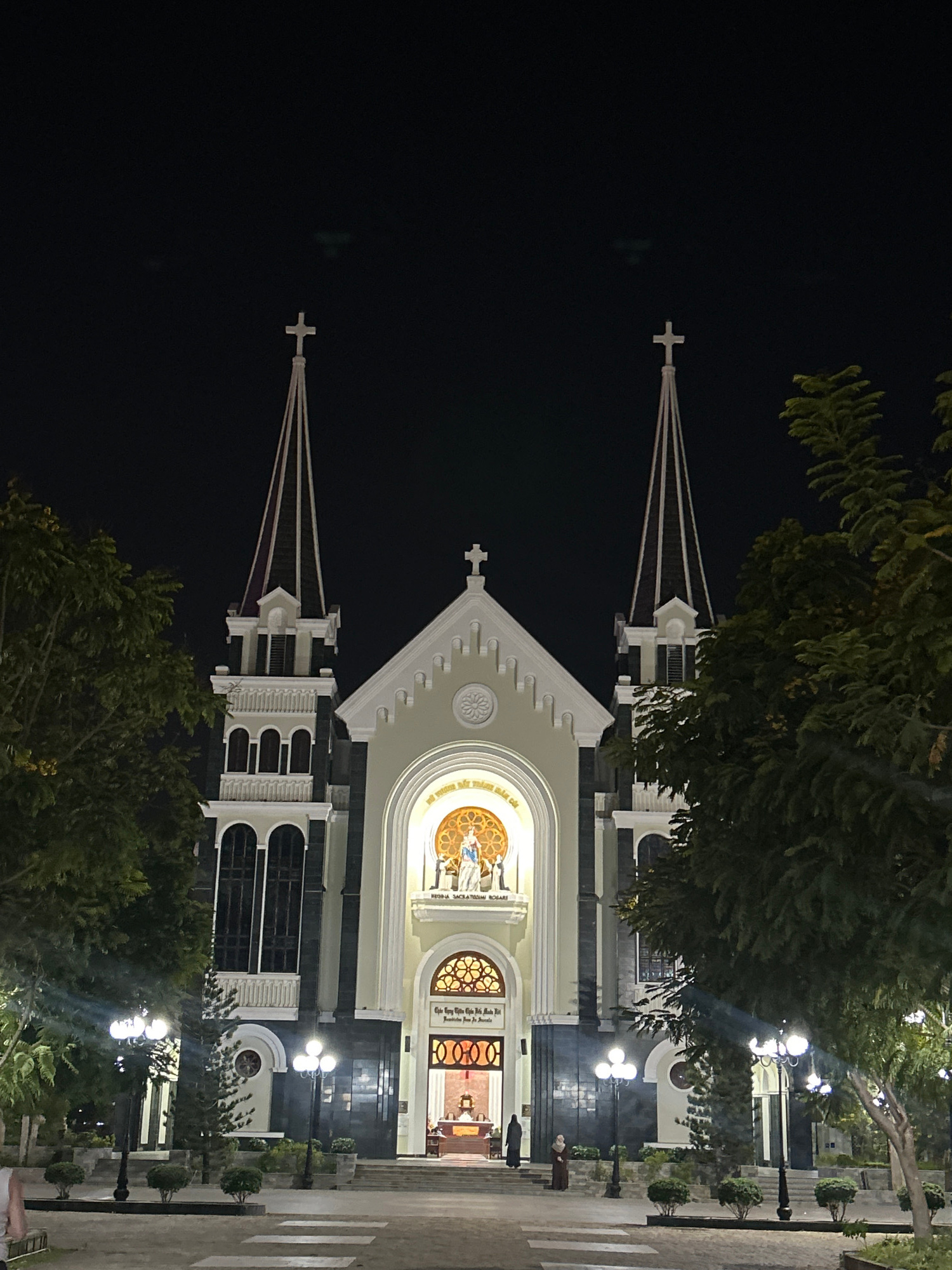 The image shows the Nha Trang Cathedral in Bắc Nha Trang, Vietnam, at night. The cathedral, a light-colored stone structure with dark accents, features two bell towers topped with crosses, flanking a…read more