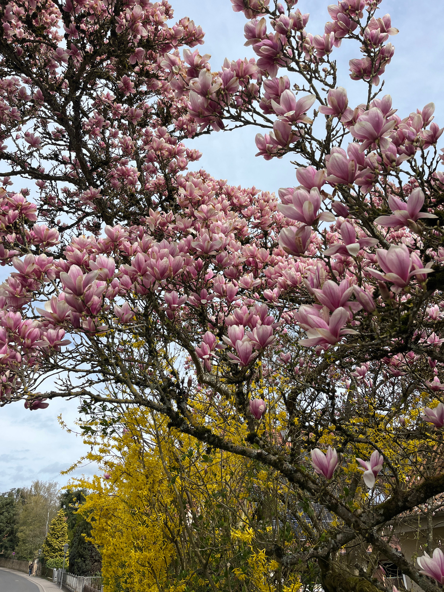 The image shows a spring scene, possibly taken in Meisenheim, Germany, featuring two trees in full bloom. On the left, a large magnolia tree is covered in pink and white flowers. To the right, a tree…read more