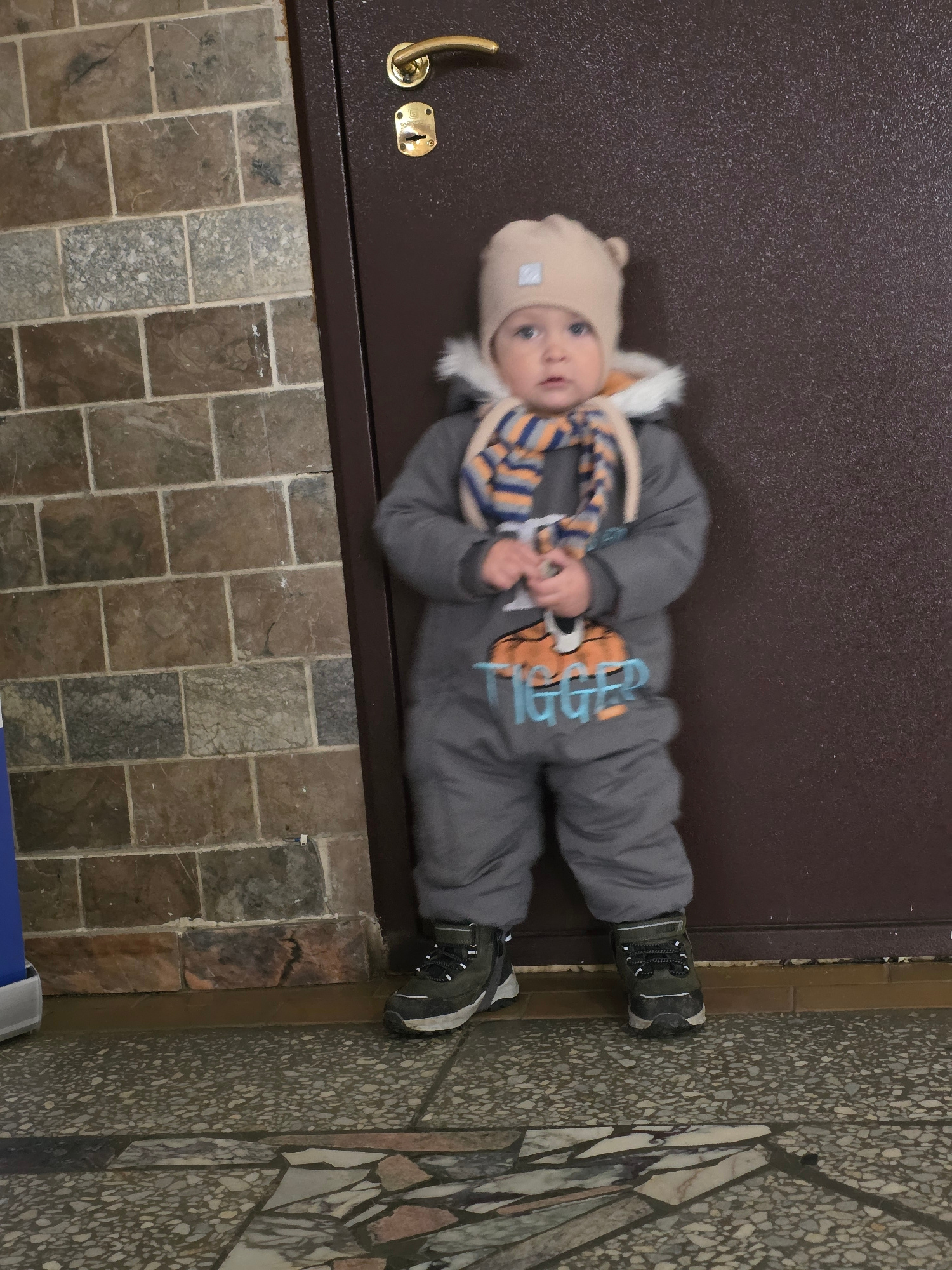 A baby wearing a gray snowsuit with an orange tiger print and a beige hat with bear ears lies on a dark brown surface next to a brick floor and a marble-patterned floor. The baby is holding an object…read more