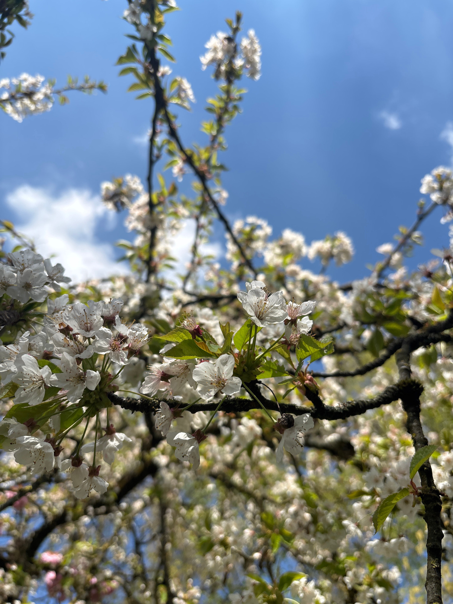 The image shows a close-up of blooming white cherry blossoms against a blue sky with scattered clouds. The branches are dark brown and thick, contrasting with the delicate white flowers. Green leaves…read more