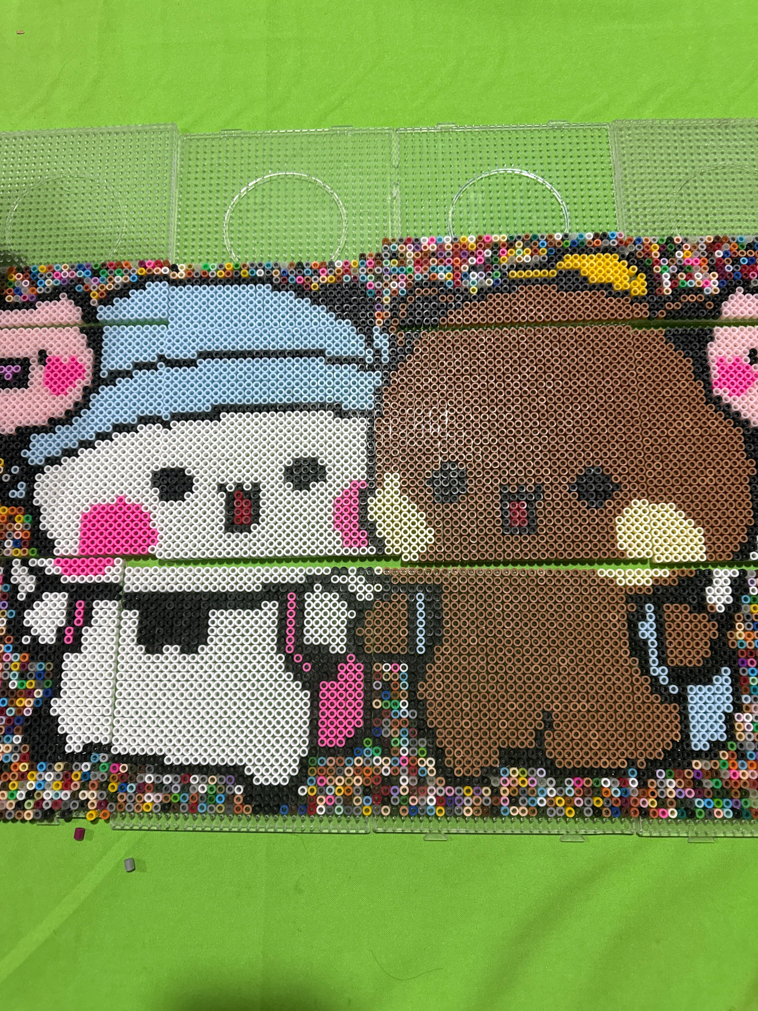 The image shows a partially completed craft project made of small, colorful plastic beads, likely fuse beads. The design depicts cartoon-like characters on a grid of interconnected clear plastic boardβ¦read more