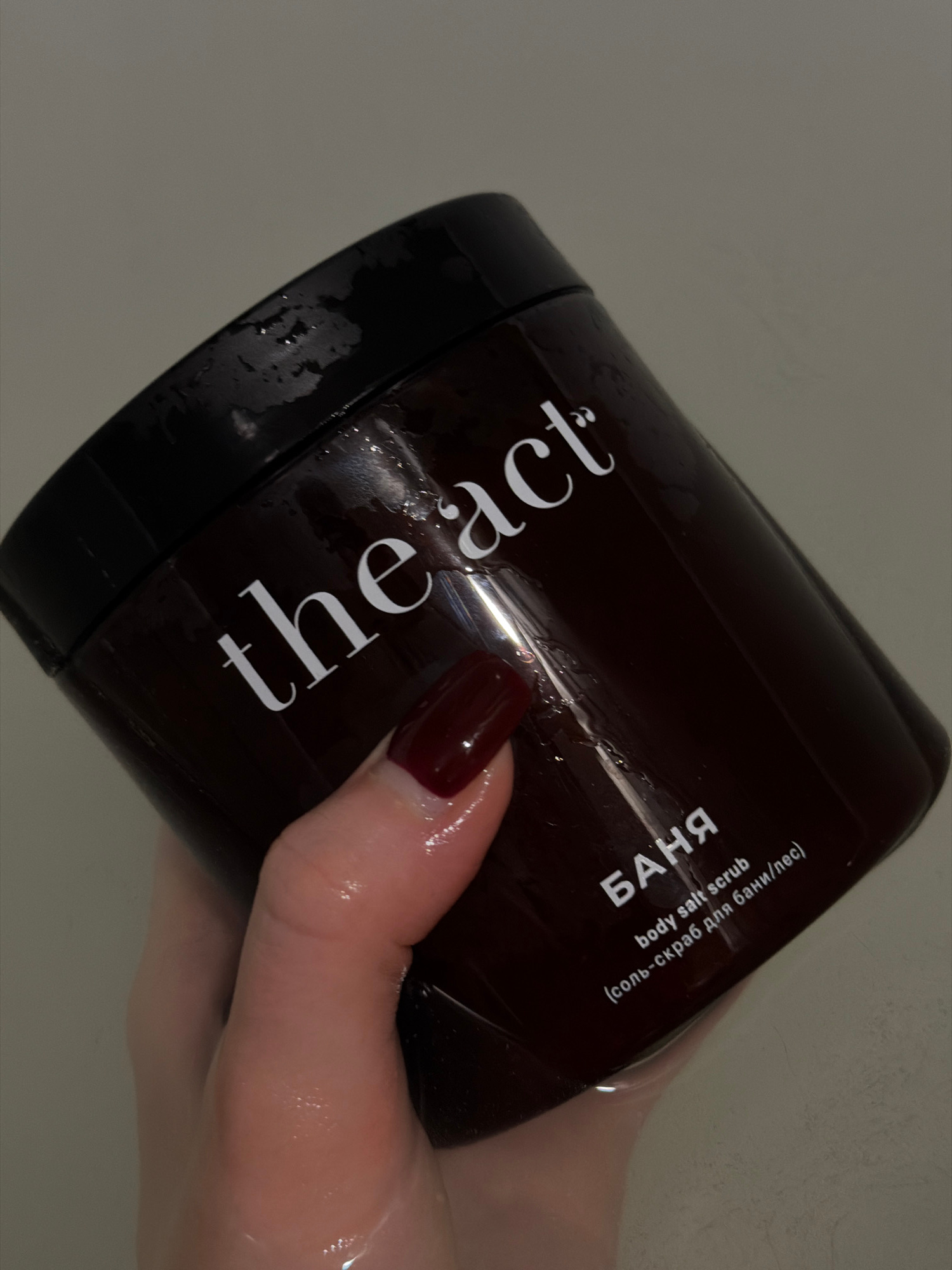 A hand holds a dark container with the words "the act" written vertically on the left and the word "БАHЯ", followed by "body salt scrub (соль-скраб для бани/лес)", on the right. The words are in white…read more
