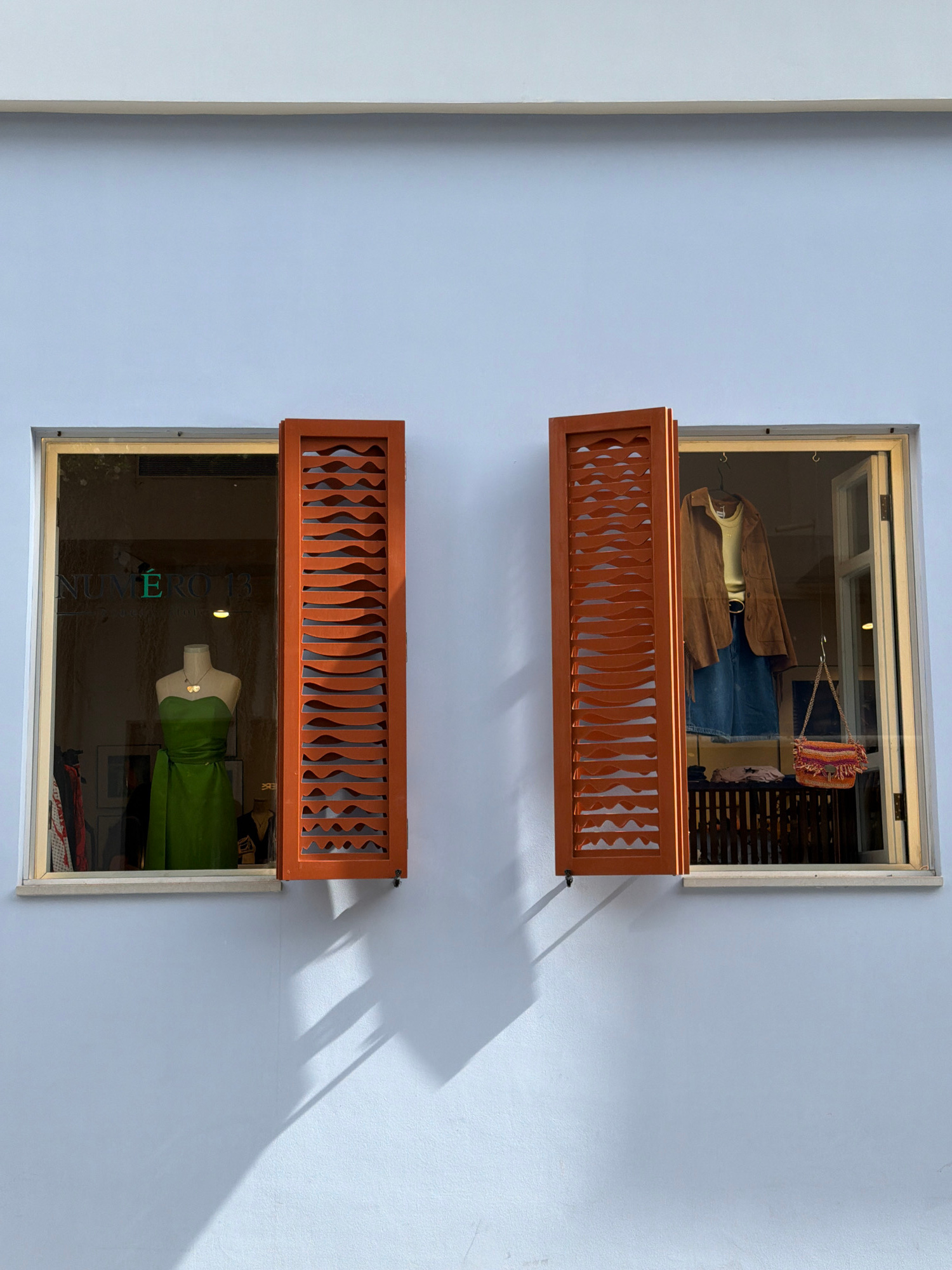 Two windows of a shop, one above the other, face the viewer. Both windows are mostly visible with an opening at the top, both of which have decorative brown panels on top that extend like awnings. The…read more