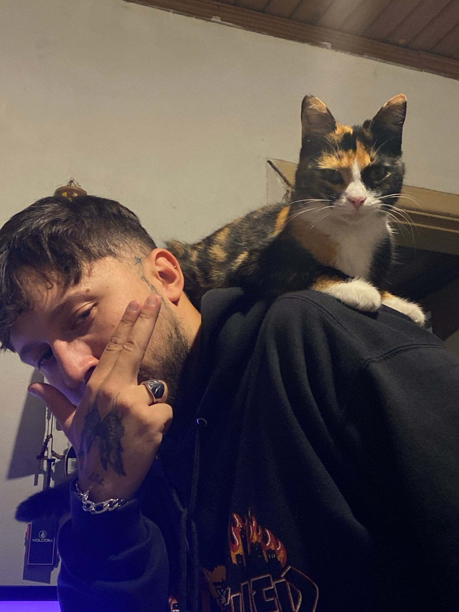 A man wearing a black hoodie is holding a calico cat. The man has tattoos on his face and hands. The environment appears to be indoors, with a wall and doorframe visible in the background. The man is…read more