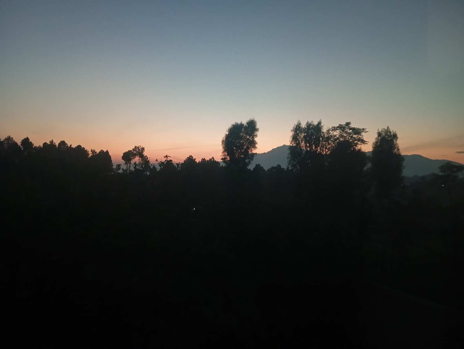 The image shows a landscape at dusk or dawn, with a gradient sky transitioning from light blue at the top to orange near the horizon. A silhouette of trees dominates the foreground, obscuring details…read more