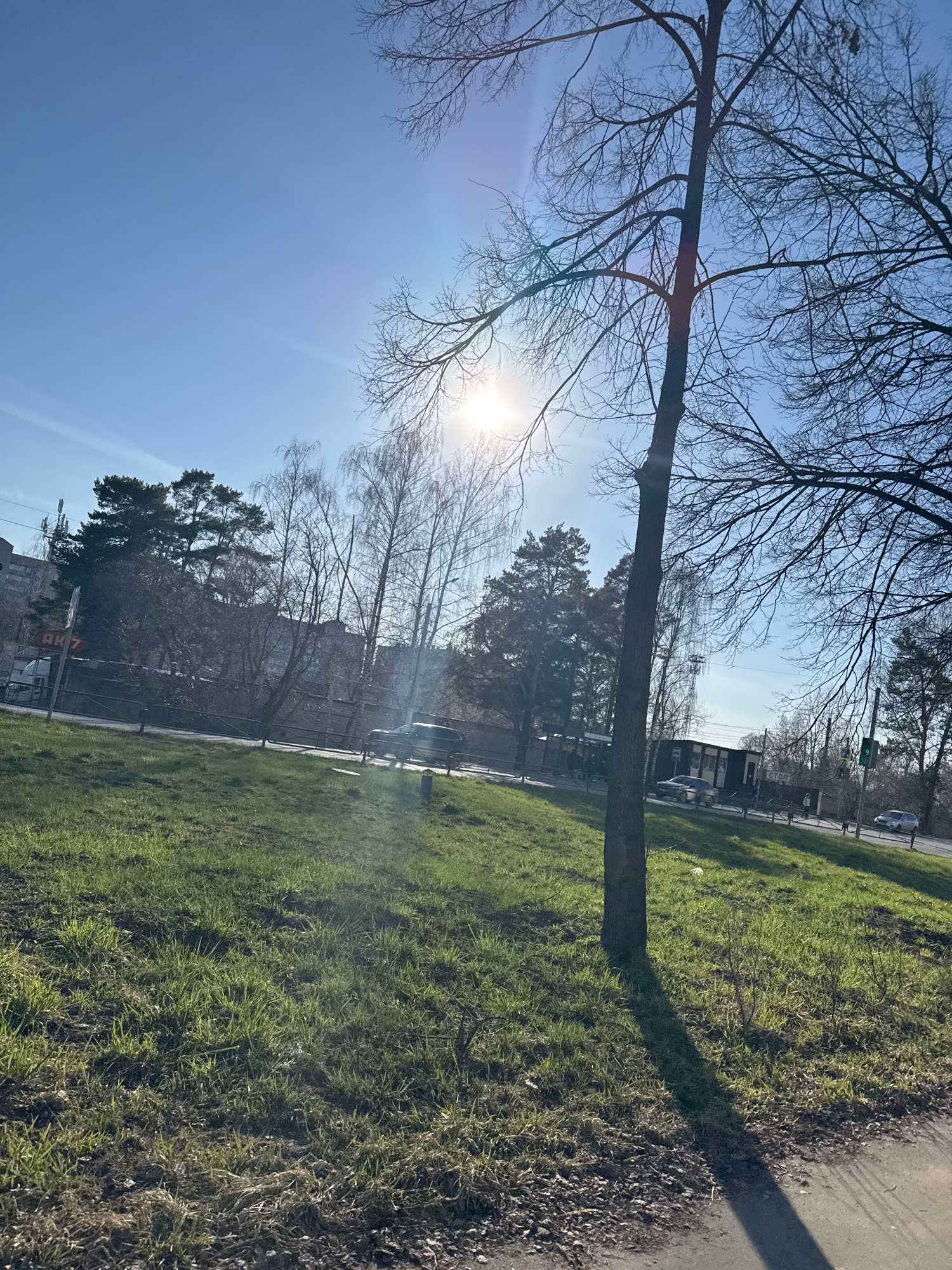 The image depicts an outdoor scene in Chaikovsky, Russia, on a clear, sunny day, likely in early spring due to the leafless trees and emerging green grass. The photo is angled upwards, showcasing a br…read more