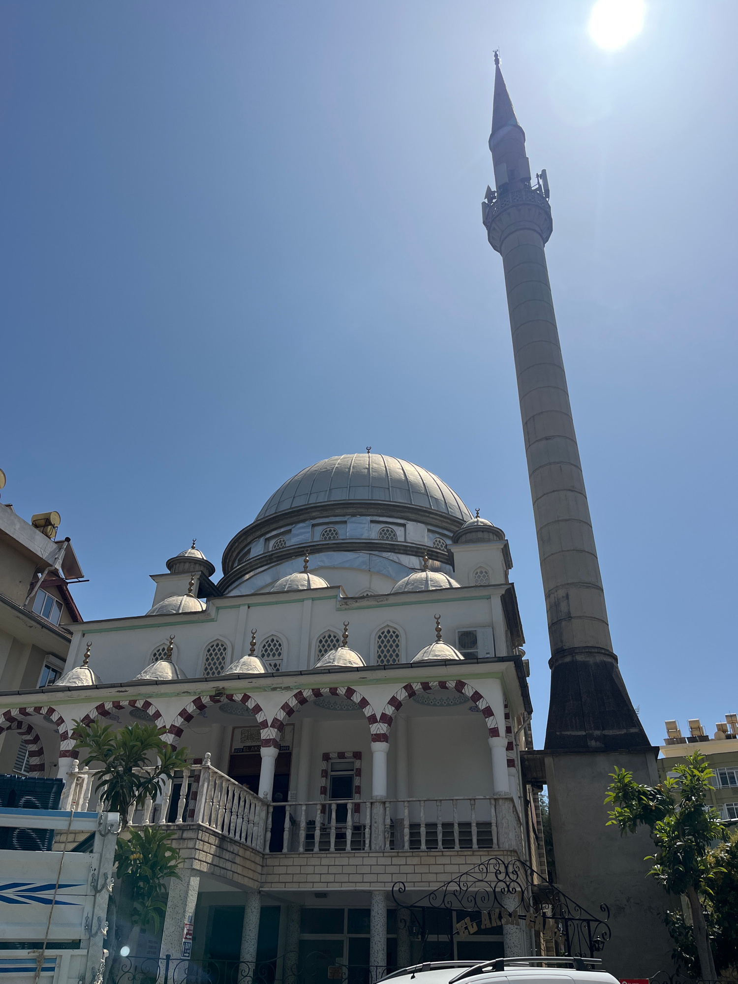The image shows a low-angle view of a mosque in Alanya, Turkey. The mosque has a large, silver dome with multiple smaller domes surrounding it. A tall, cylindrical minaret rises from the side of the m…read more
