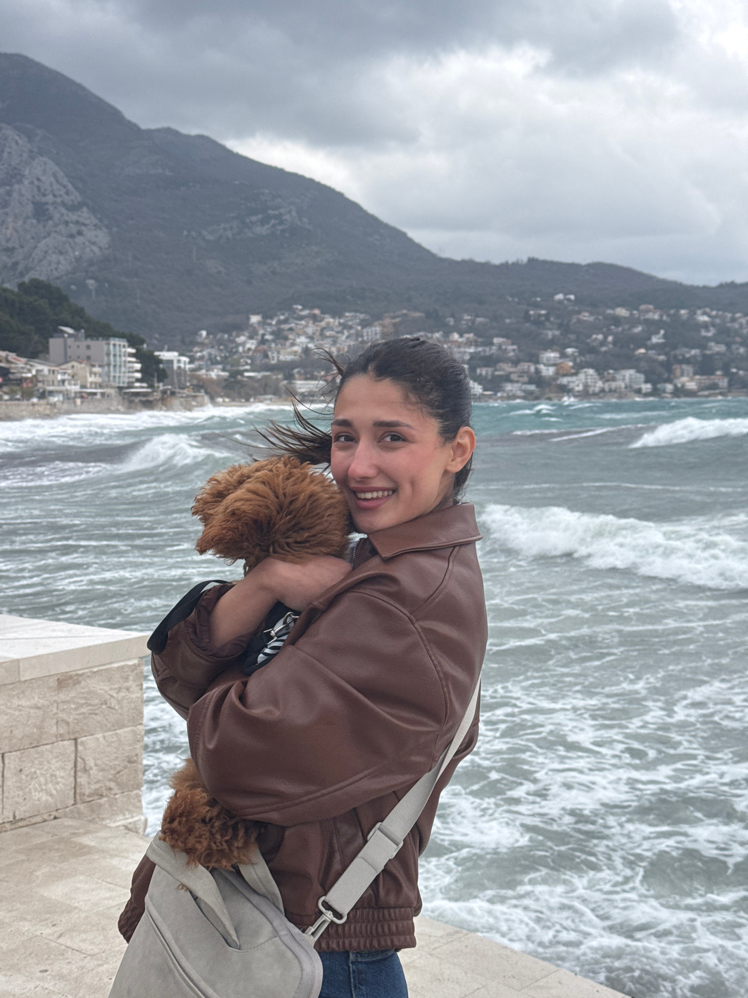 A young adult female is depicted standing on a stone promenade in Sutomore, Montenegro, facing the viewer and smiling. She wears a brown leather jacket, blue jeans, and a light grey shoulder bag worn…read more