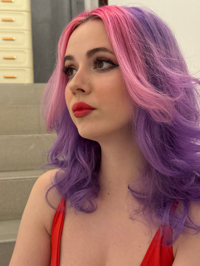 A woman with striking pink and purple hair, styled in loose waves, is the focal point. She's wearing red lipstick and a red top. Her gaze is directed downwards with her head tilted slightly. The backg…read more
