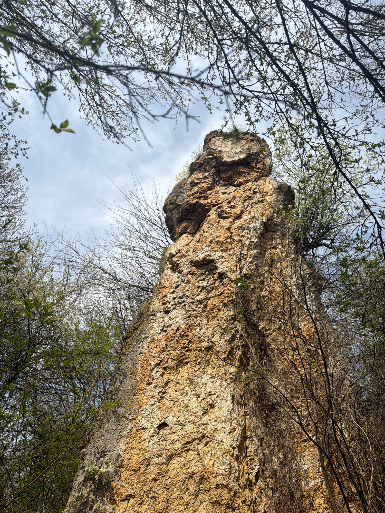 The image depicts a low-angle view of a natural rock formation in Lukovit, Bulgaria, with trees and sky visible in the frame. The rock is predominantly tan and brown in color, exhibiting a rough, textβ¦read more