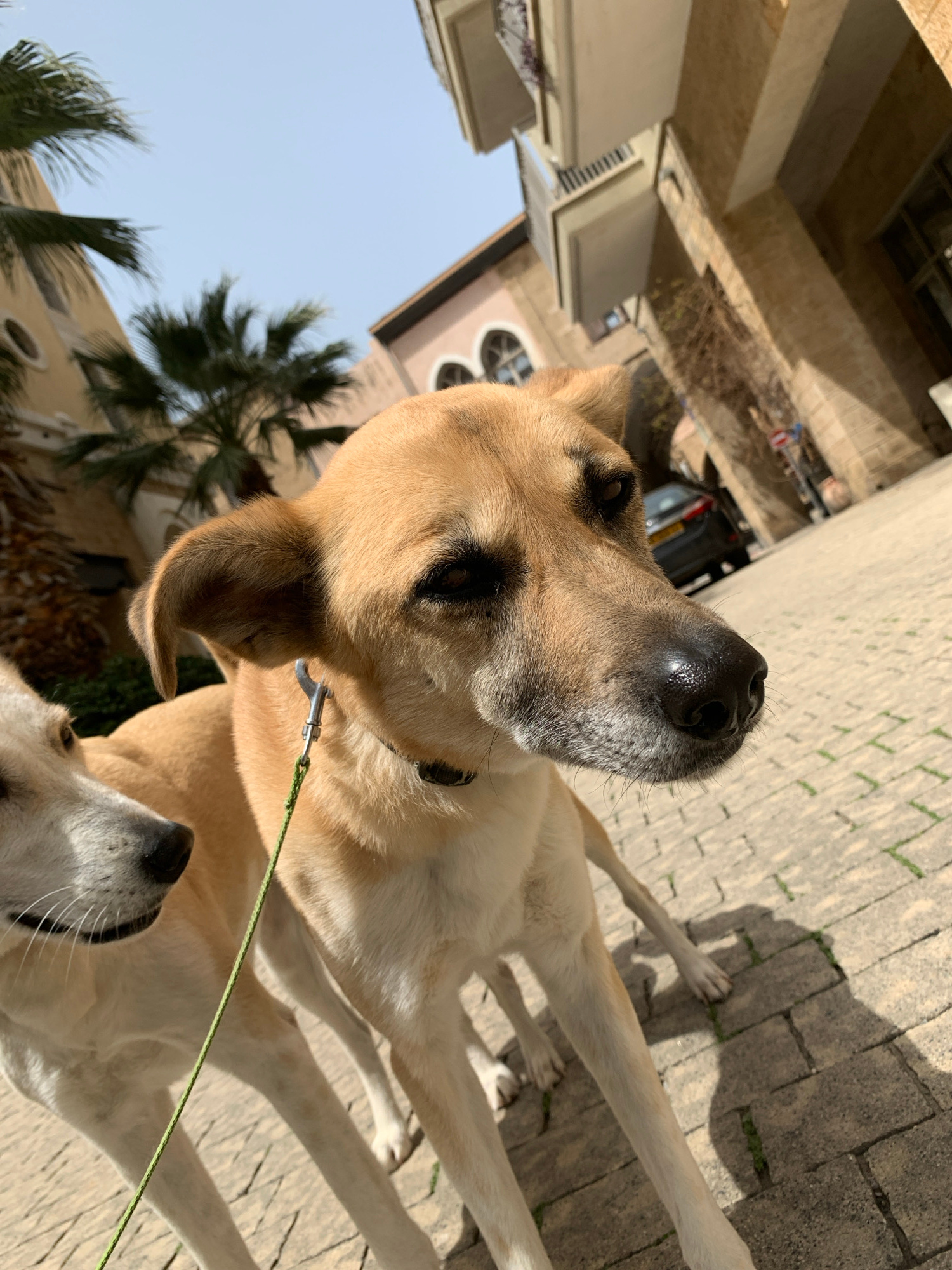The image shows two dogs on a leash, likely in Tel-Aviv, Israel. The foreground dog is light brown with a black nose and appears to be looking upwards. Another dog, partially visible, is off-white wit…read more