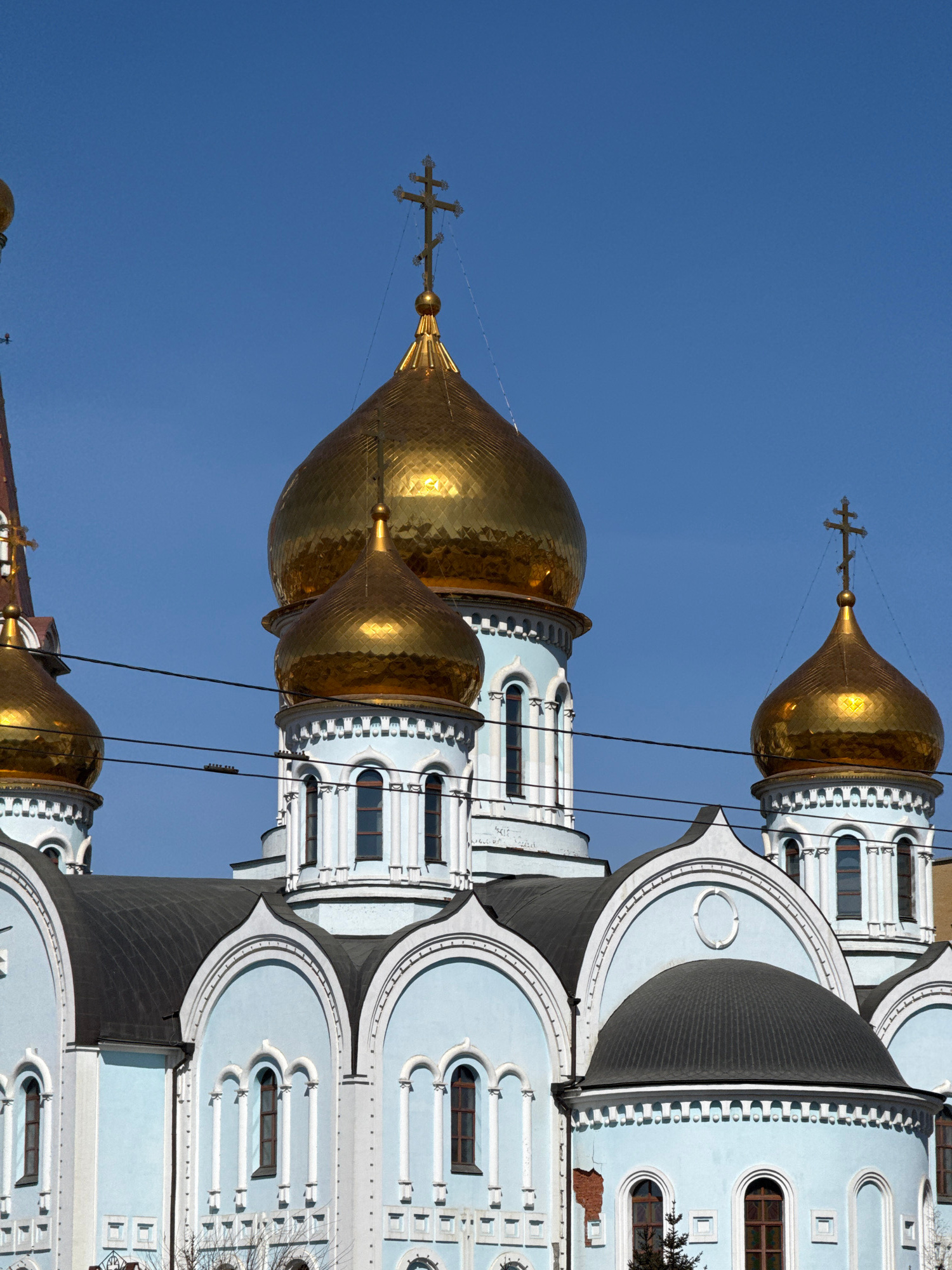 The image shows the Church of the Kazan Icon of the Mother of God in Chita, Russia. The building has golden domes with crosses atop them. The walls of the church are light blue. The background is a cl…read more