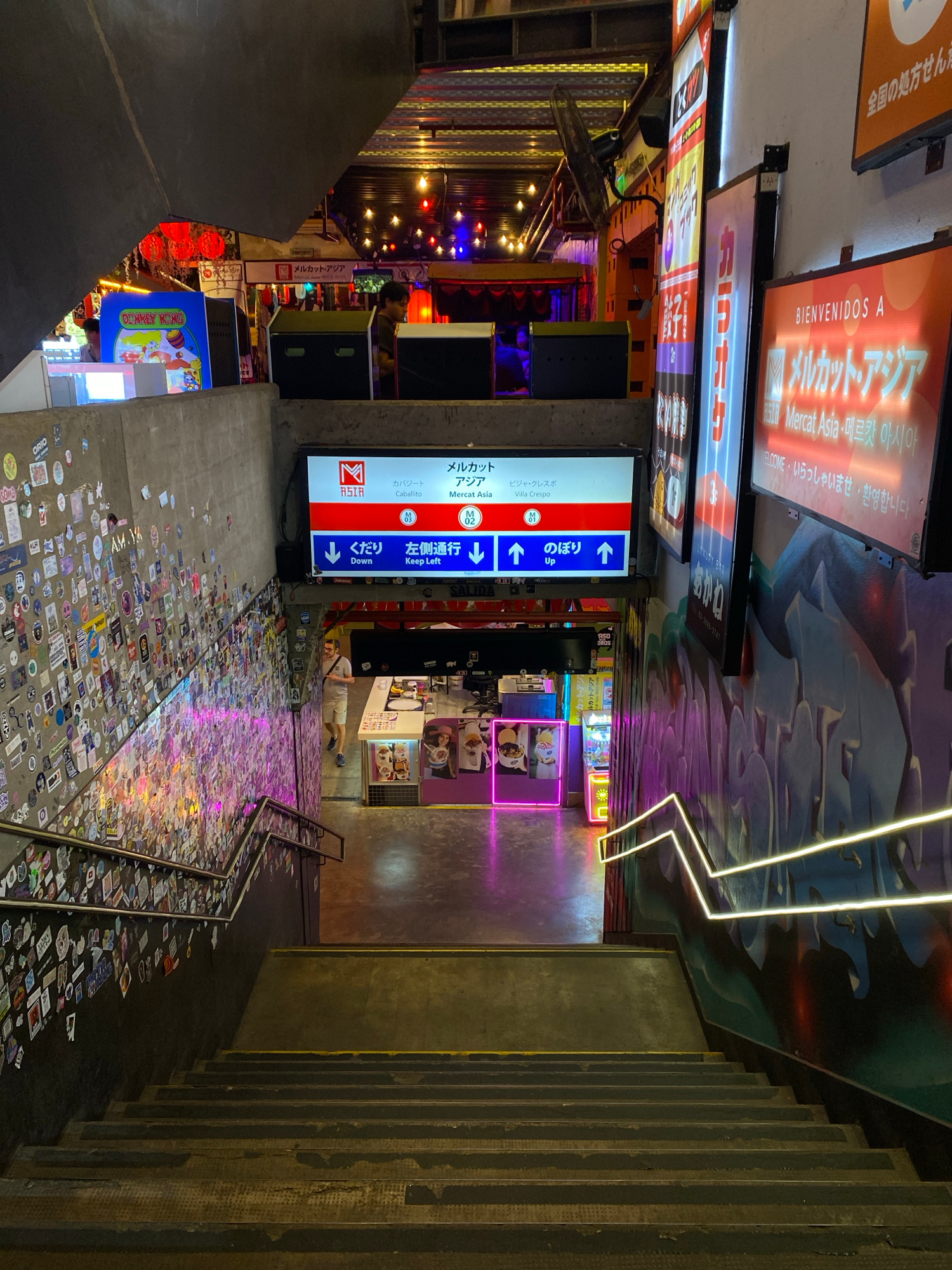 The image shows a stairway and hallway within a vibrant commercial district, possibly a food court or marketplace, in Buenos Aires, Argentina. A sign in the center, indicates "Mercat Asia" in multipleβ¦read more