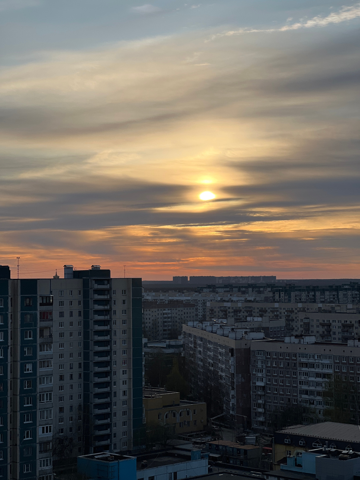The image captures a sunset over Saint Petersburg, Russia. The sun is partially obscured by clouds, creating streaks of light in the sky. Below the sky, a dense urban landscape unfolds, featuring mult…read more