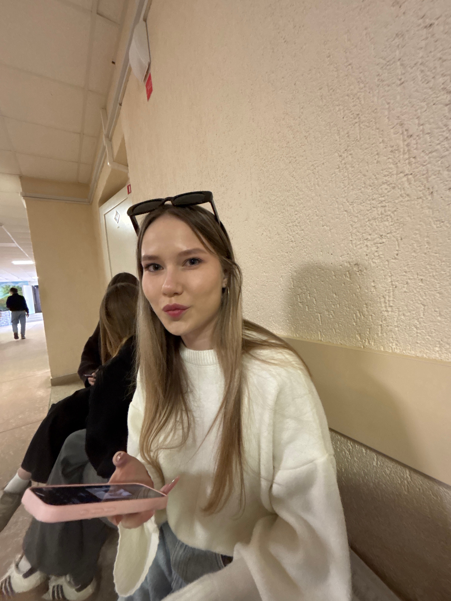 A young woman is taking a selfie in a building in Chaikovsky, Russia. She has long blonde hair and is wearing a white sweater. Sunglasses are perched on her head. She is holding a pink smartphone in h…read more