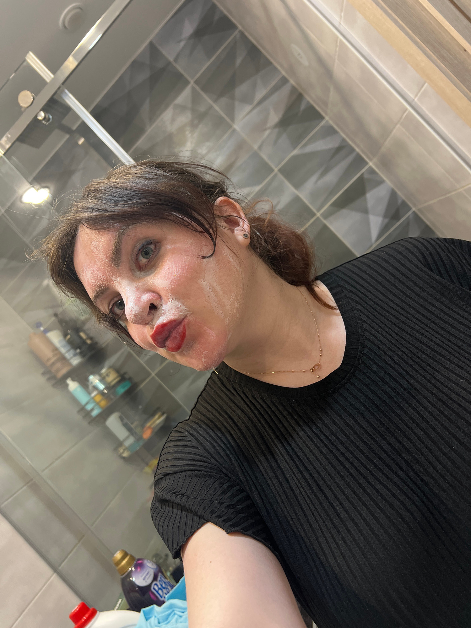 A woman is standing in a bathroom. She is wearing a black, ribbed shirt and a delicate gold chain necklace. Her face is partially covered with a white, foamy substance, possibly a facial cleanser. Her…read more