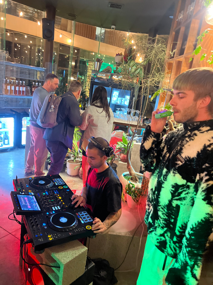 The image depicts an active indoor venue in Tel-Aviv, Israel, resembling a modern bar or club environment. In the foreground, a male individual with short, light-colored hair and a beard is seen in pā¦read more