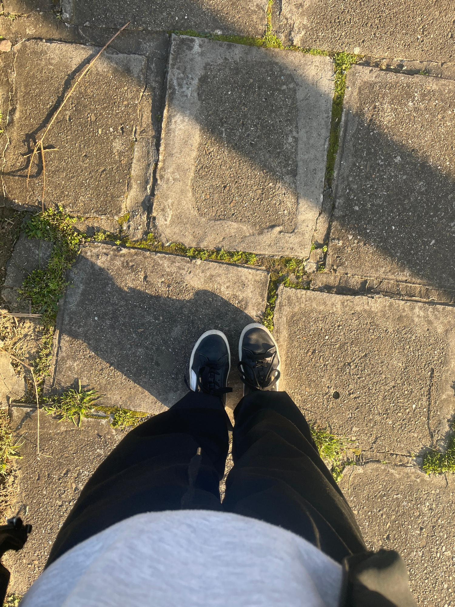 The image shows a person standing on a paved surface, possibly a sidewalk or patio. The pavement consists of square concrete slabs with grass growing in the cracks between them. The person is wearing…read more