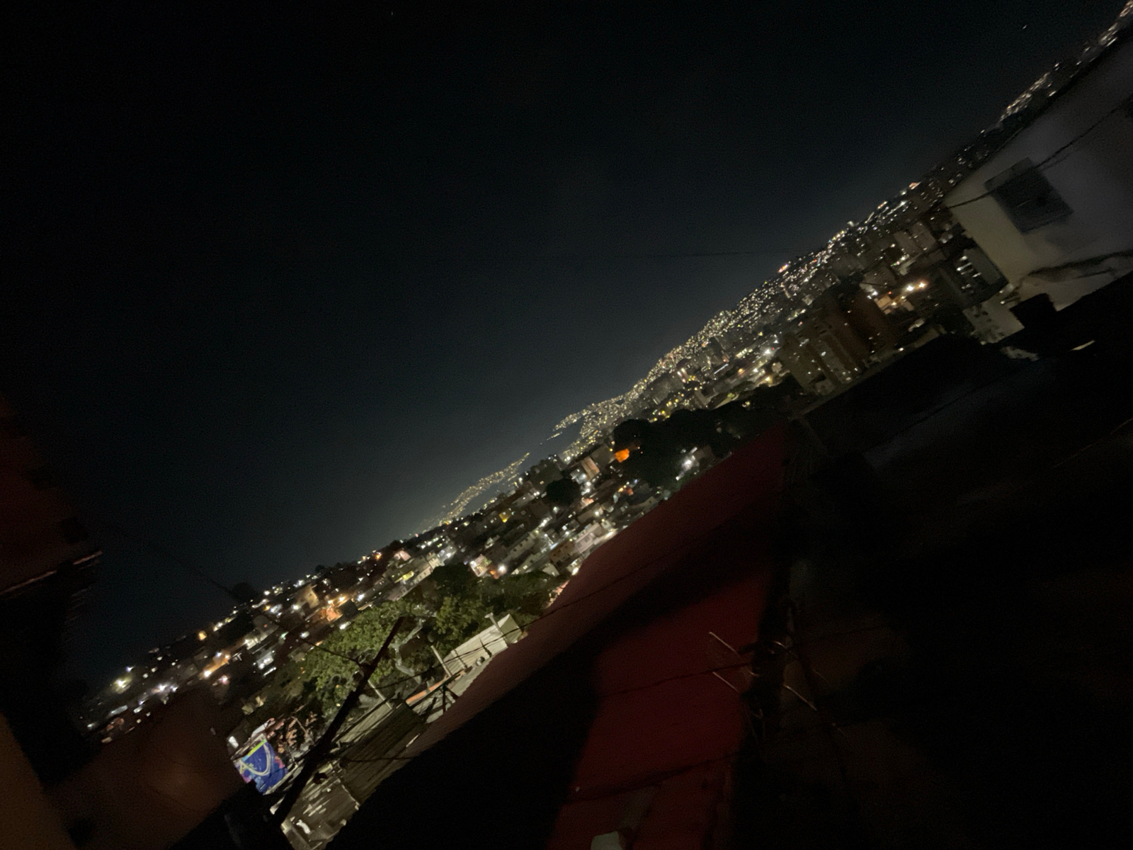A tilted, long-exposure, night view of a city at the base of a hill or mountain range with scattered bright lights, likely from houses and streets. The foreground shows parts of a building or structur…read more