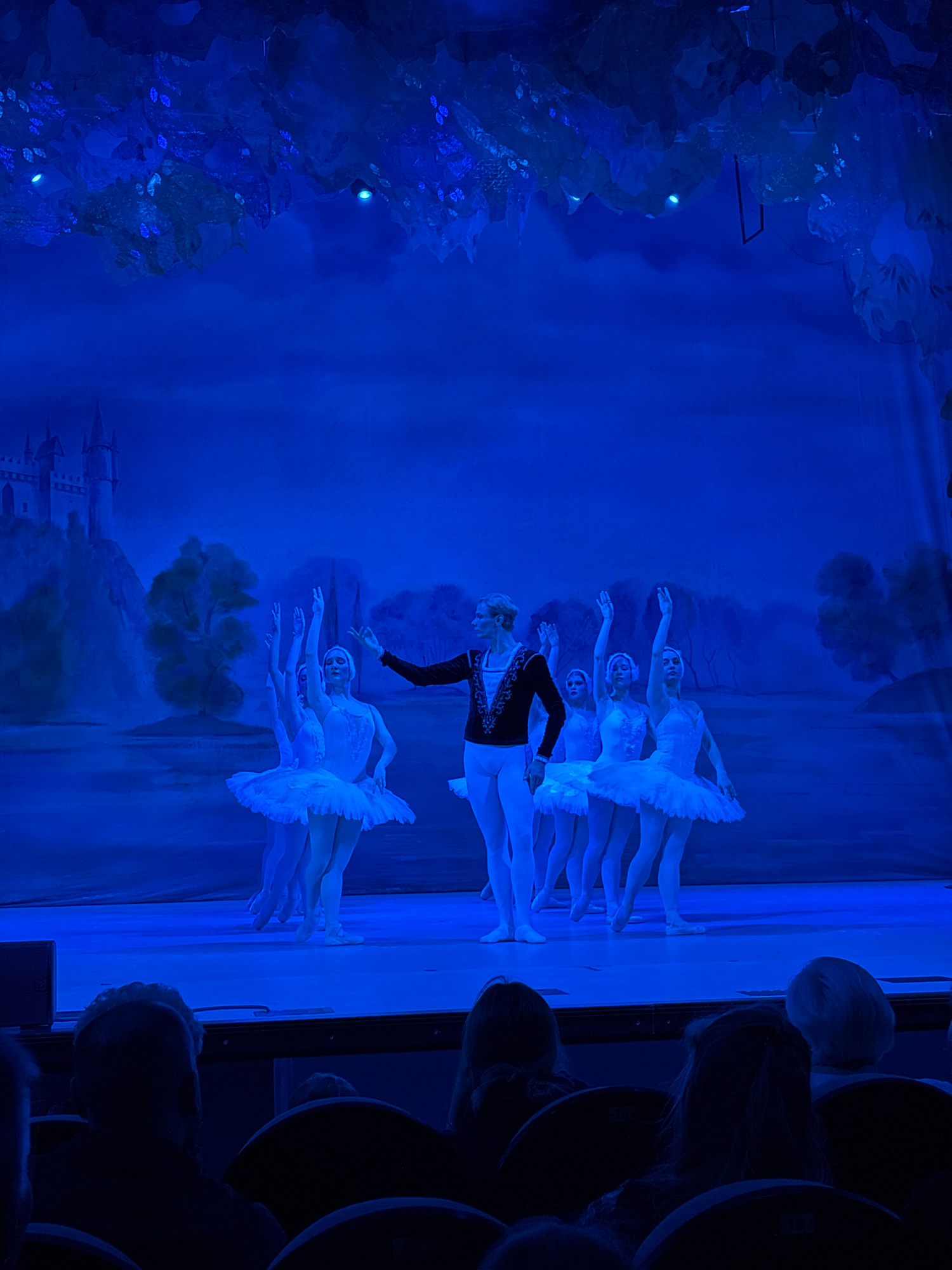 The image depicts a ballet performance in Ulyanovsk, Russia. On stage, a male dancer in a black and red costume stands amidst ballerinas in white tutus, positioned in two rows. The backdrop features a…read more