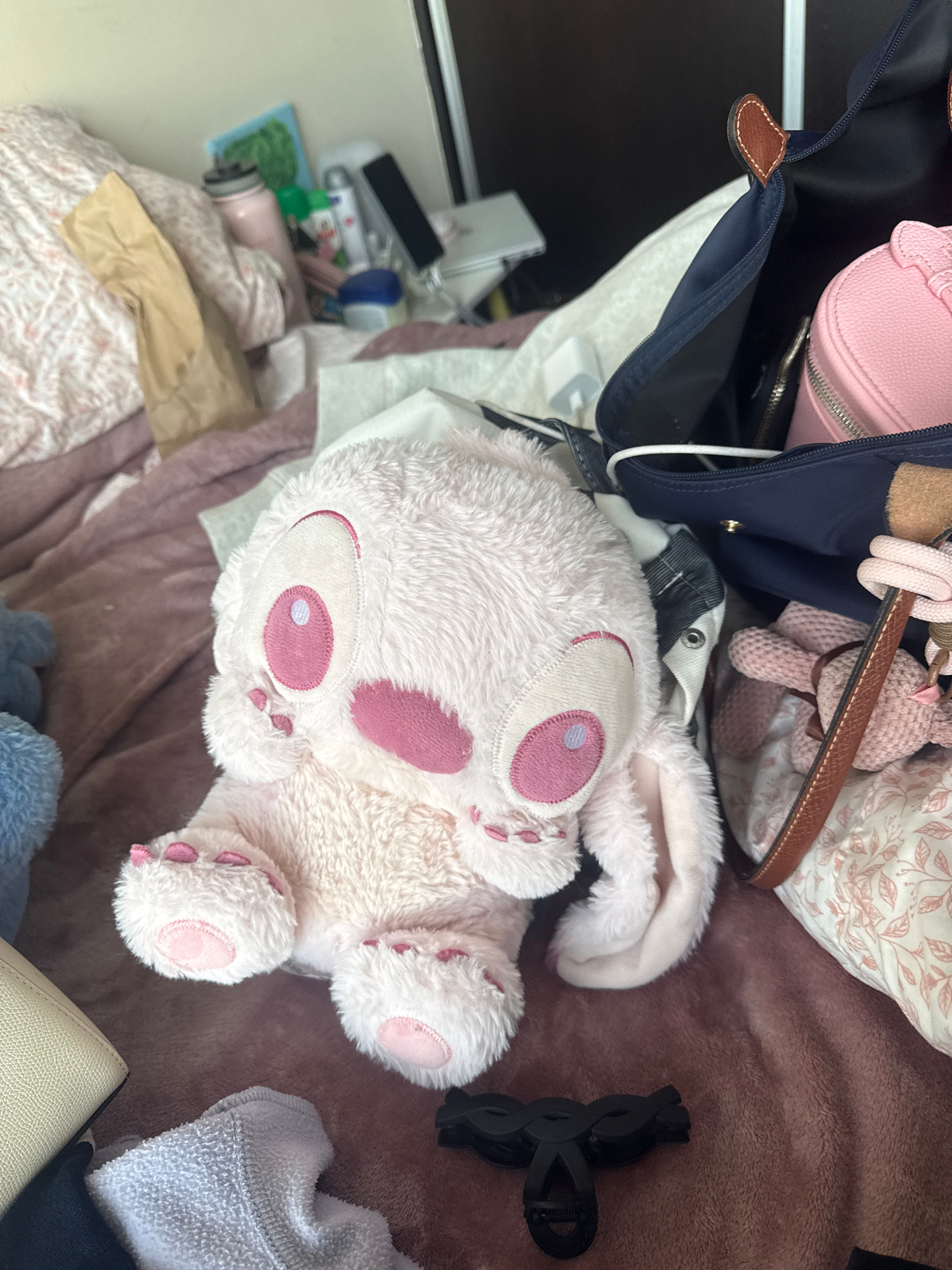 The image shows a cluttered scene, likely indoors, possibly a bedroom or living area. A pink and white plush toy resembling an alien-like creature with large, round eyes is the central focus. The toy…read more