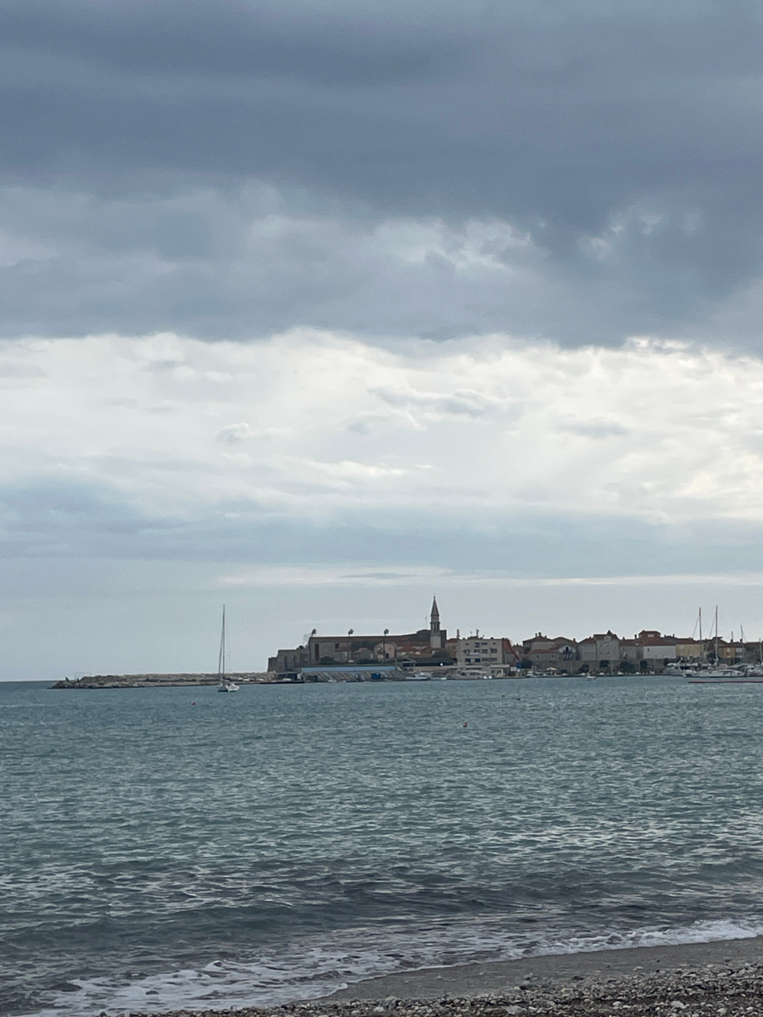 The image shows a coastal view of Budva, Montenegro, under an overcast sky. The scene is divided between the sky with heavy, gray clouds and the Adriatic Sea. The sea, marked by ripples, stretches to…read more