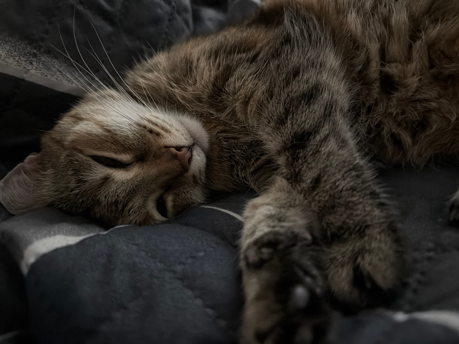 The image shows a tabby cat asleep on a dark gray, quilted blanket. The cat is lying on its side with its face resting on the blanket. Its eyes are closed, and its whiskers are visible. The cat's fur…read more