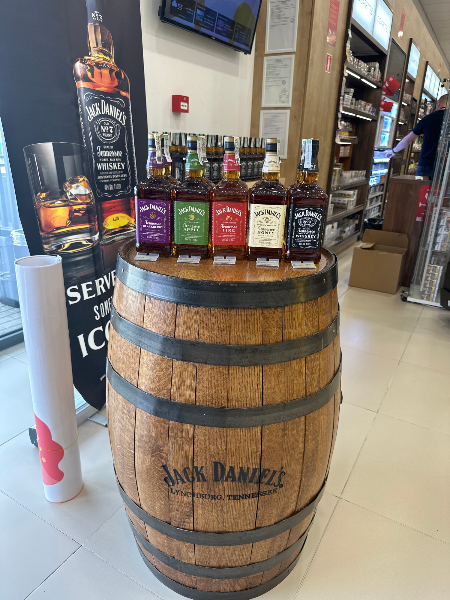 The image captures a Jack Daniel's promotional display in a retail setting, likely a duty-free shop, possibly in Kulata, Bulgaria (based on retail signage and currency). A wooden barrel with "Jack Dan…read more