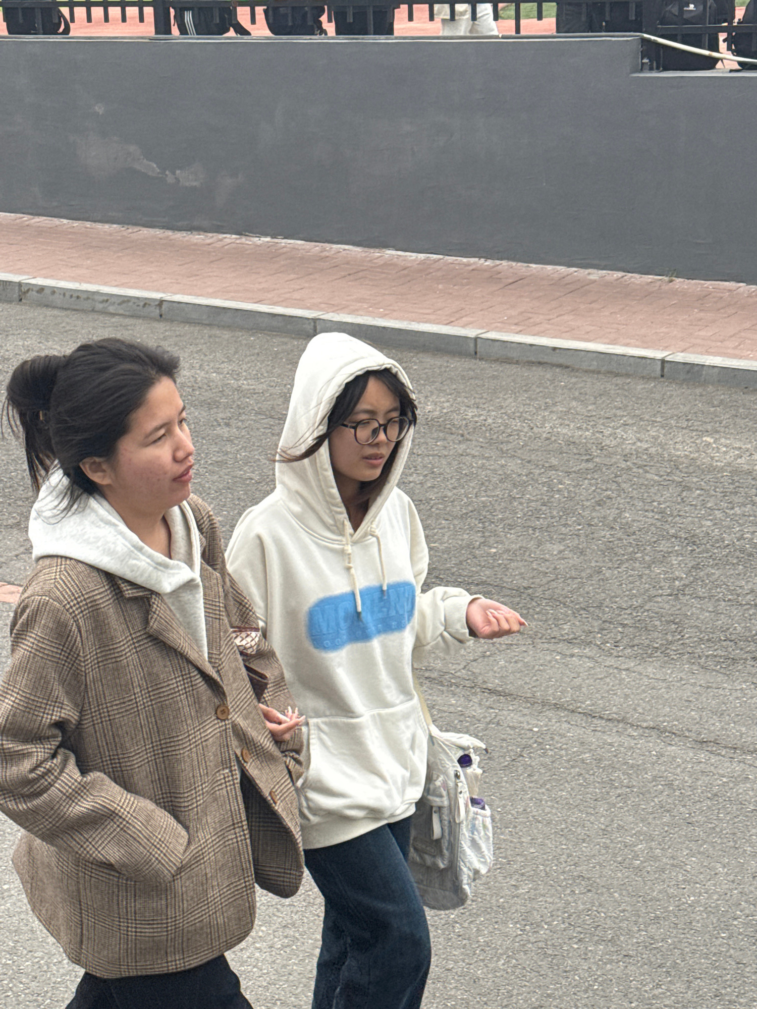 Two Asian women are standing next to each other on an asphalt surface. The woman in the foreground is wearing a brown plaid blazer over a white hoodie, with her dark hair pulled back into a low ponyta…read more