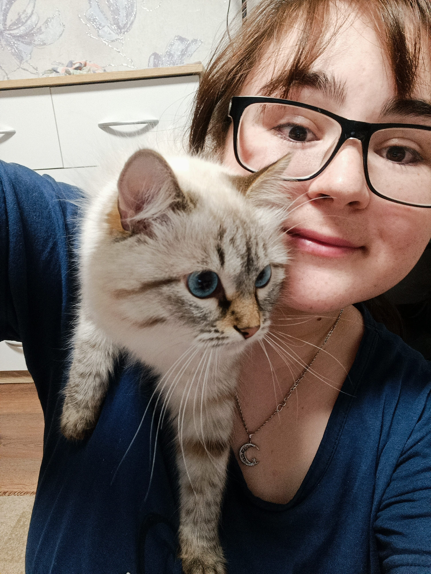 A person wearing glasses and a blue shirt is holding a cat. The cat has blue eyes and light brown and gray fur. The person is also wearing a necklace with a crescent moon pendant. There is a white dre…read more