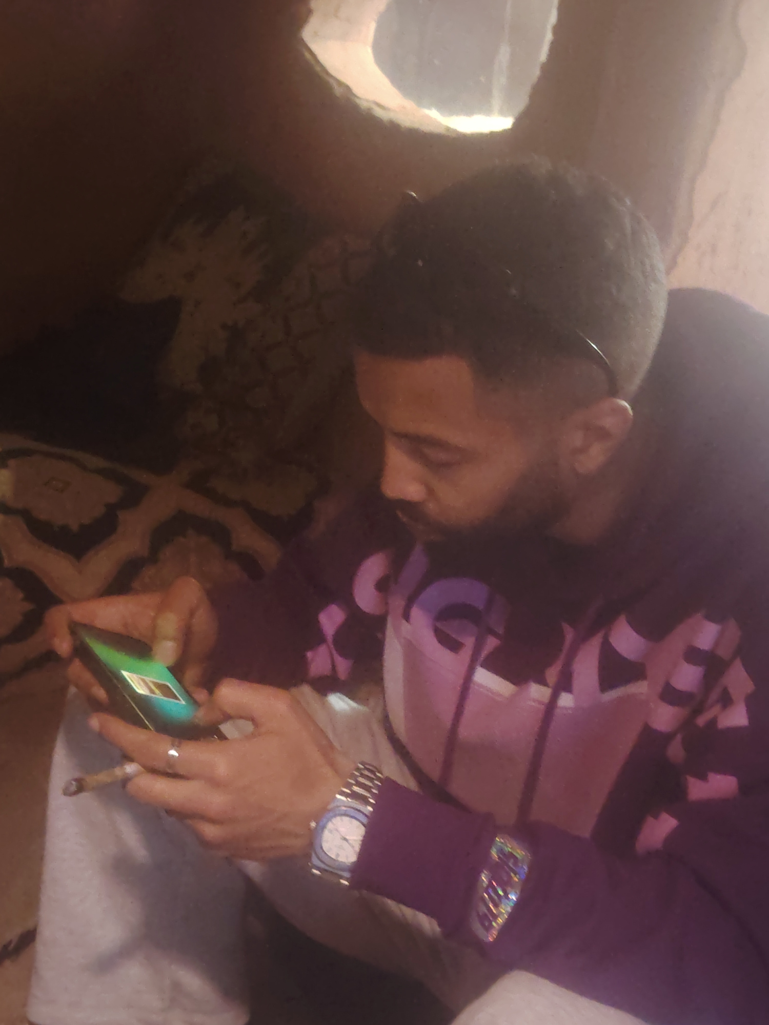 A man is indoors, holding a phone in his hands. A partially smoked cigarette is positioned near his right hand. He is wearing a purple hoodie with pink lettering, grey sweatpants, and a watch with a b…read more