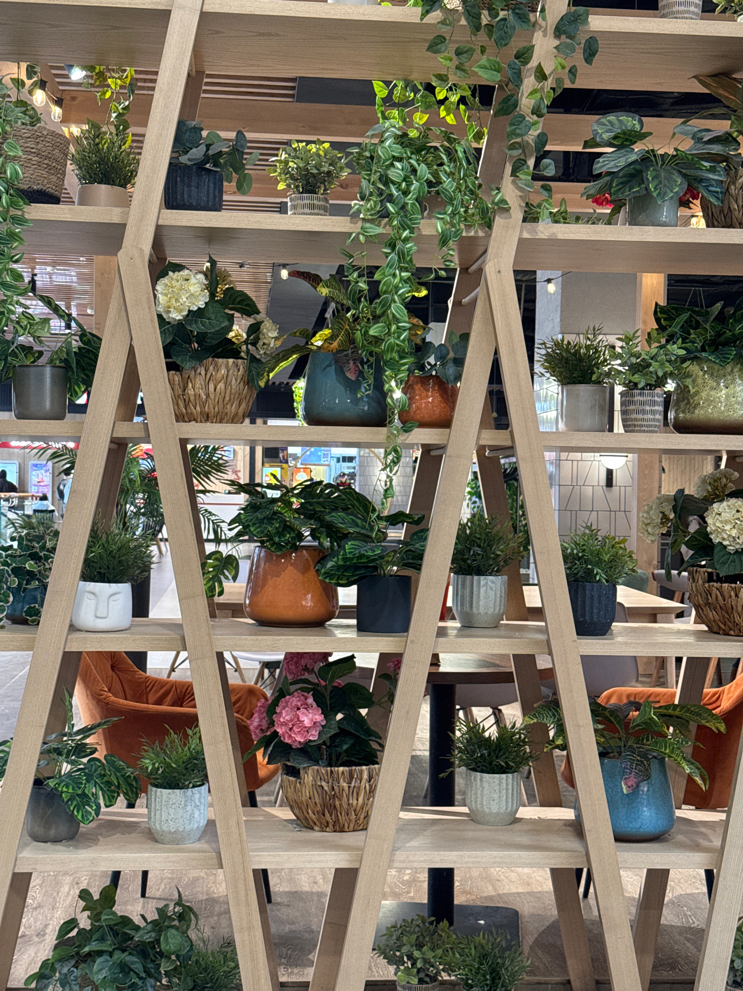 This image depicts a modern indoor commercial space, likely a cafe, restaurant, or lounge, in Izhevsk, Russia. The central feature is a large, light-colored wooden trellis or grid structure, which isβ¦read more