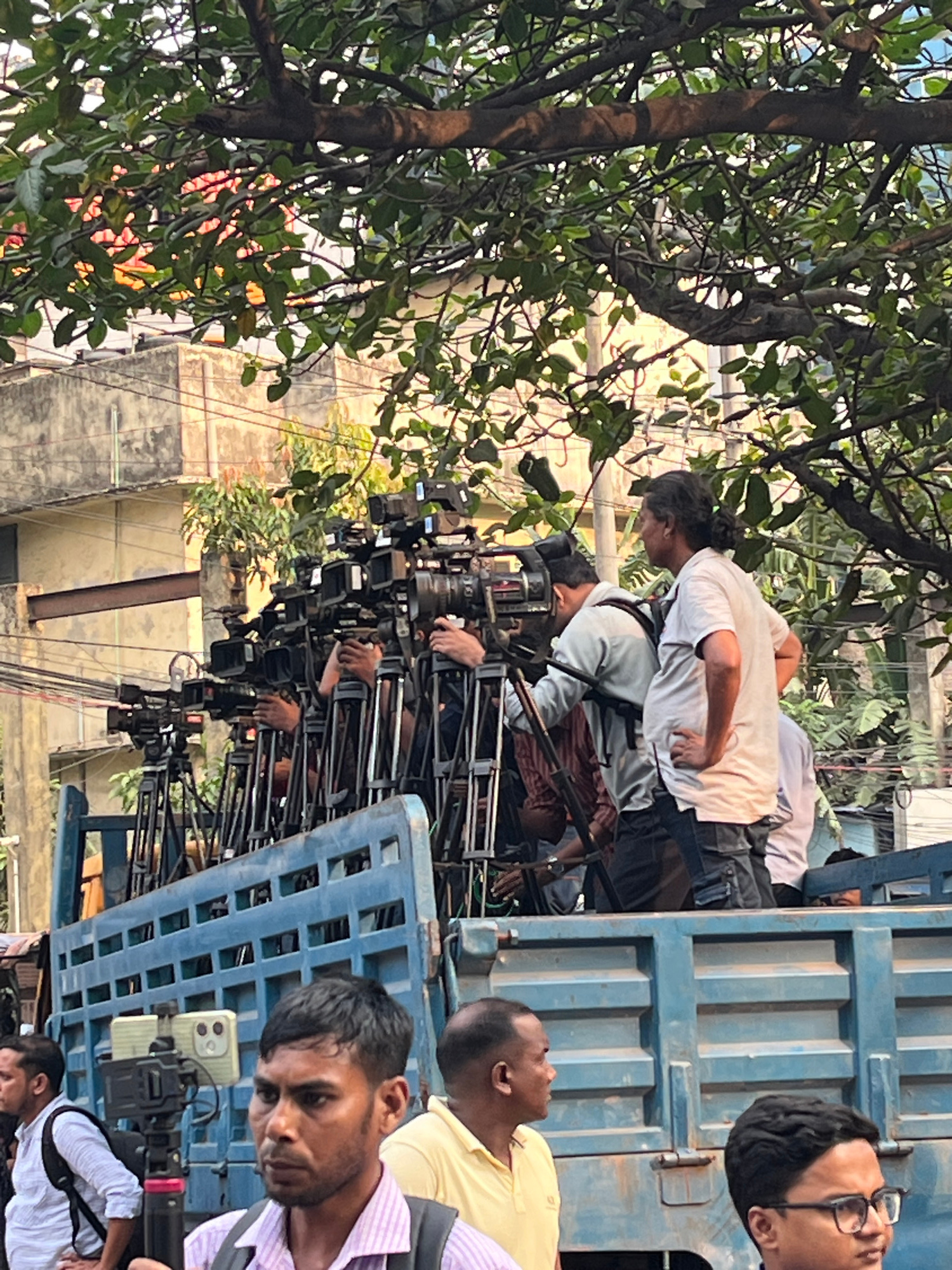 A group of people are standing on the back of a blue flatbed truck, holding cameras on tripods. The people on the truck seem to be filming something, and there is a crowd of cameras. The truck is park…read more