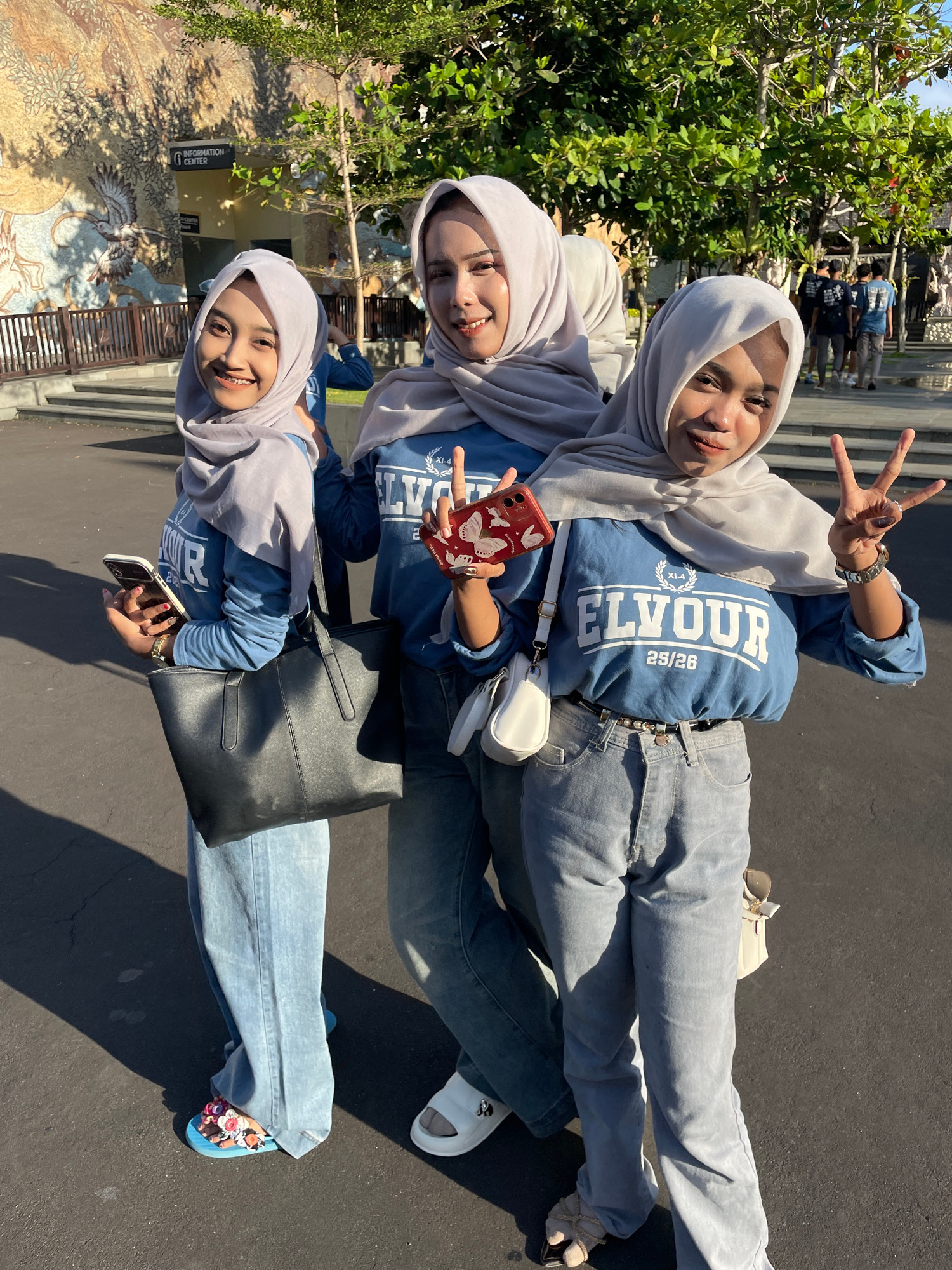 Three young women, likely friends, are captured in an outdoor setting, posing cheerfully for a photo. All three are wearing light grey hijabs and matching blue long-sleeved tops or sweatshirts with li…read more
