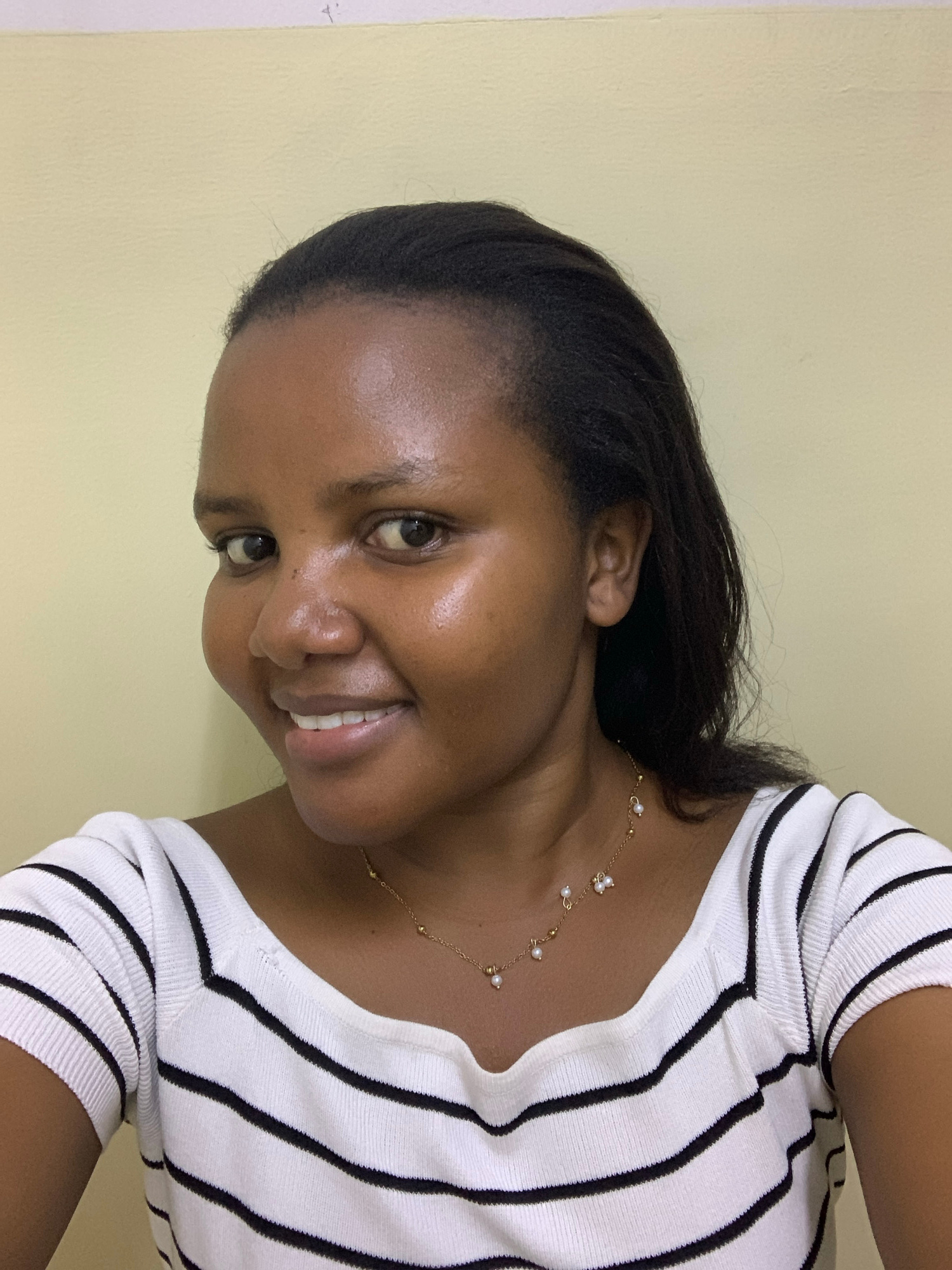 A medium shot of a dark-skinned woman. She has a wide smile, dark hair, and is wearing a white and black striped shirt with a gold necklace. The background is a plain, light yellow wall. The location is unknown, and there is no information to suggest that this image was taken in Dar es-Salaam, Tanzania. | Open Wire