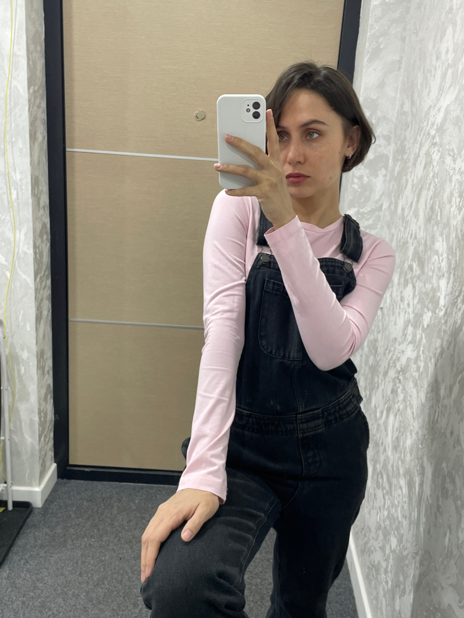 A young woman is captured in a mirror selfie, looking directly towards the camera with a neutral to slightly pensive expression. She has short, dark hair, and light-colored eyes (appearing greenish or…read more