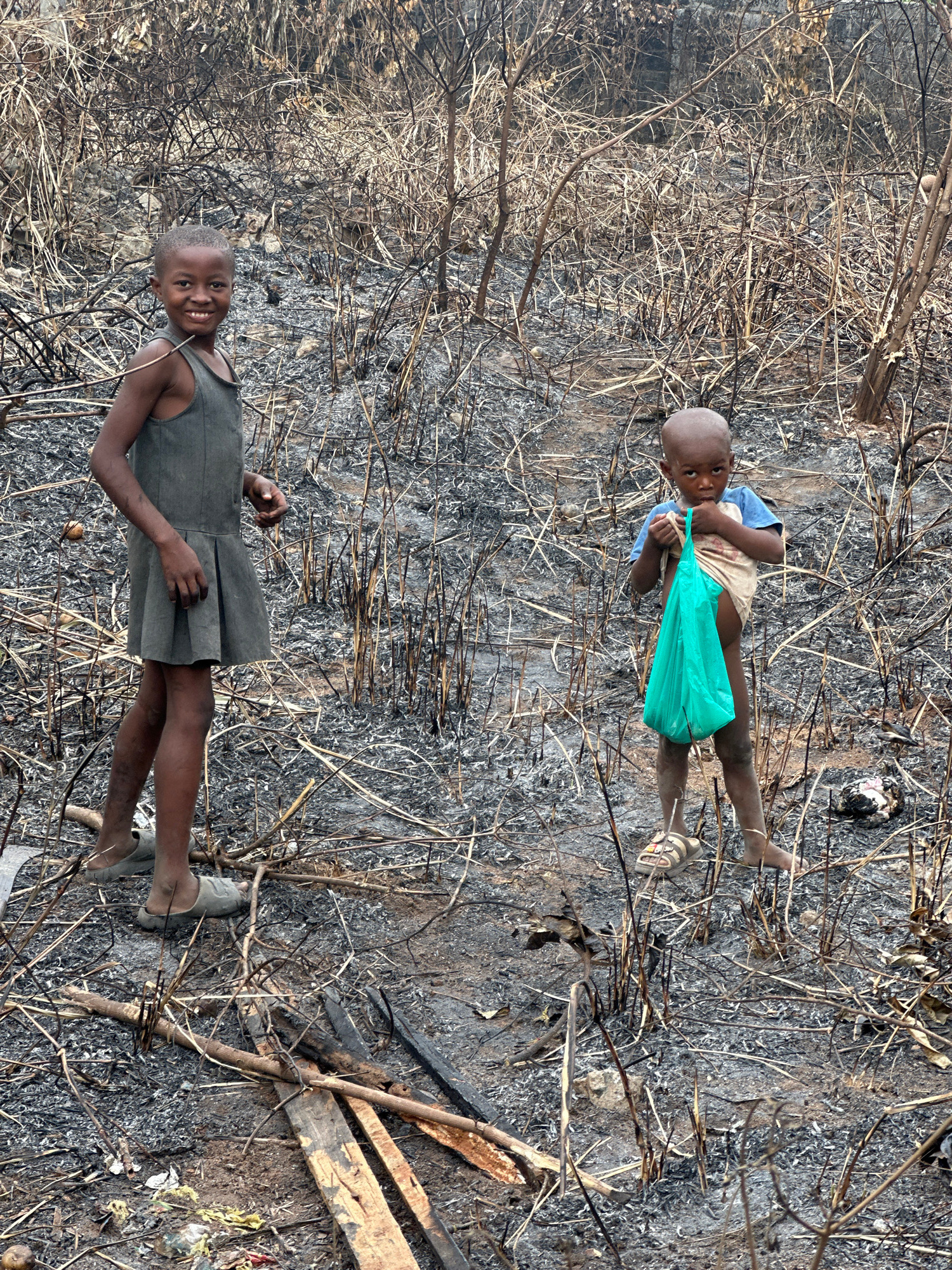 The image displays two children standing amidst a recently burned landscape in the city of Ihiagwa, Nigeria. The ground is predominantly covered in grey ash and blackened, brittle plant stalks, indica…read more