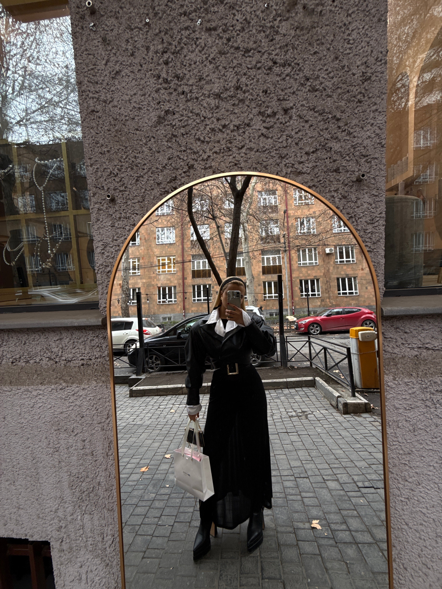 A full-length, arched mirror with a gold frame stands vertically on a textured, grey stucco building exterior in Yerevan, Armenia. The mirror reflects a female-presenting individual taking a selfie wi…read more