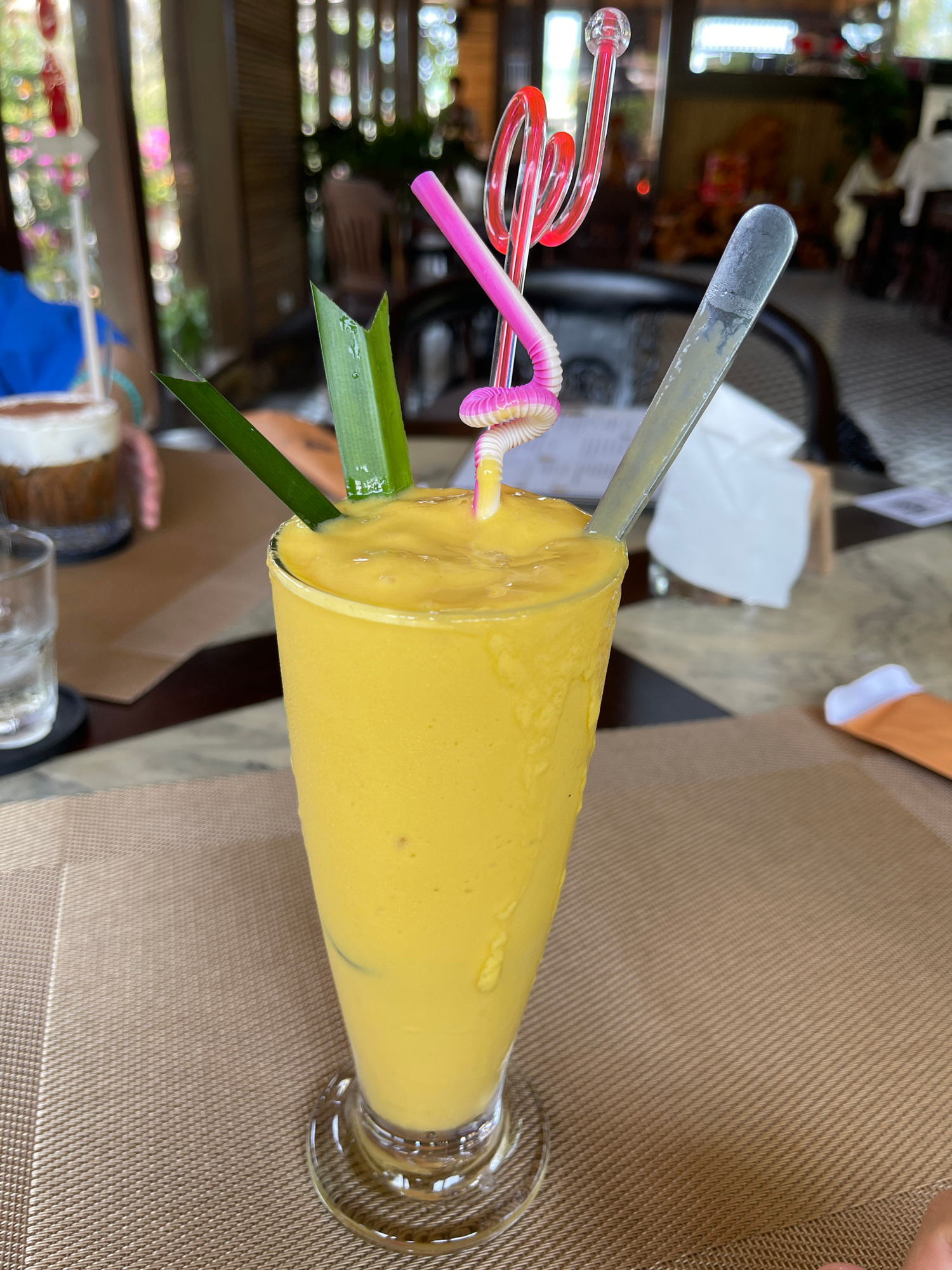 The image captures a vibrant yellow, thick beverage, likely a fruit smoothie or shake, served in a tall, clear glass with a stemmed base. The drink appears rich and creamy, with a few small specks sug…read more